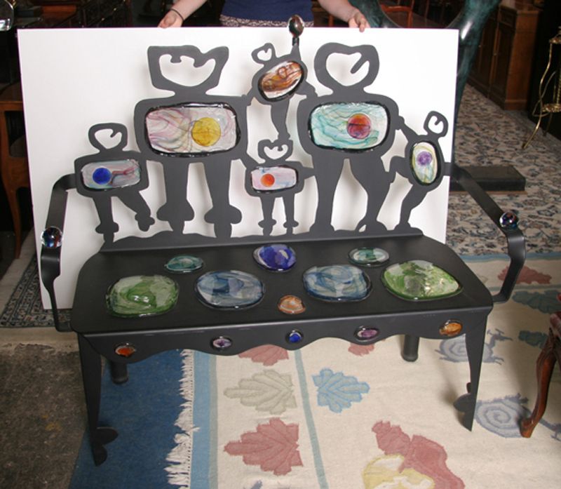 Art Glass Black Bench, Cast Iron Black Bench with Blown Glass Inserts