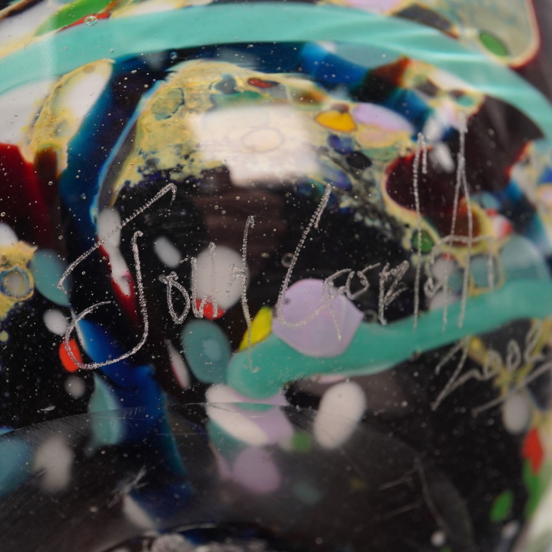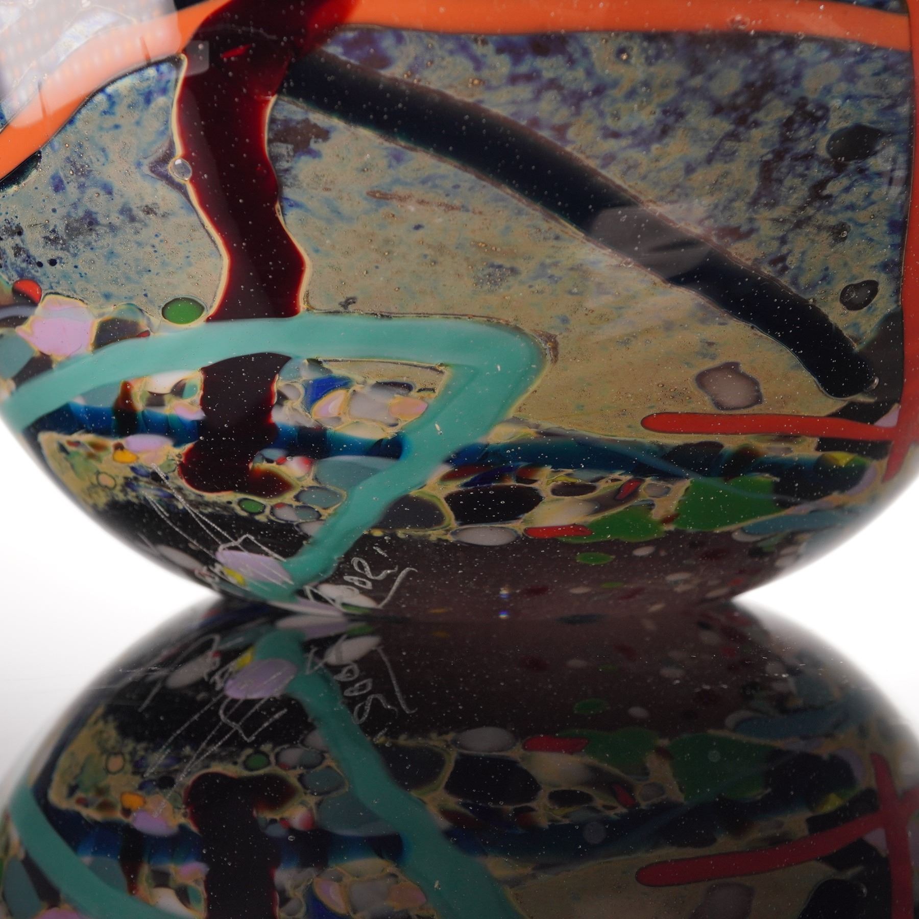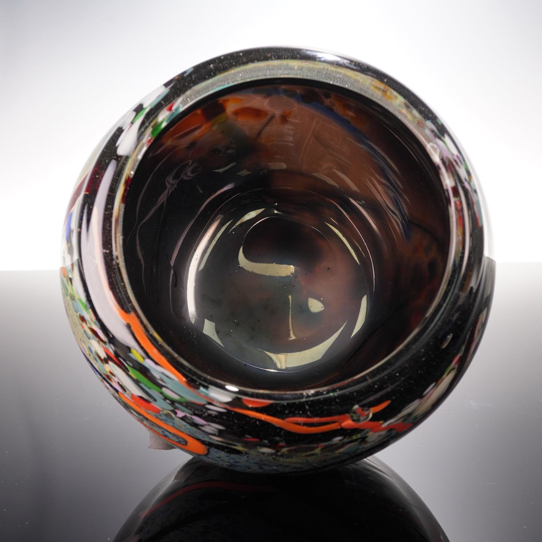 This striking art glass bowl is signed by artist John Gerletti and dated 2002. The piece showcases a dynamic and abstract design with vibrant millefiori elements, featuring an intricate mix of colors including red, green, blue, and orange. The colorful inclusions create a unique visual experience, enhanced by the bold contrast against the dark background of the glass. This bowl, with its modern art appeal, is a standout piece that will add a bold statement to any collection.