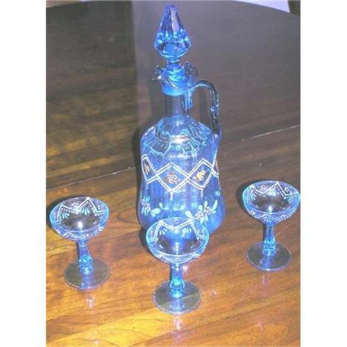 Beautifully hand decorated Art Glass decanter with three matching glasses. Circa 1925. Probably from Slovakia. <p>Shipping is determined after checkout. <p>