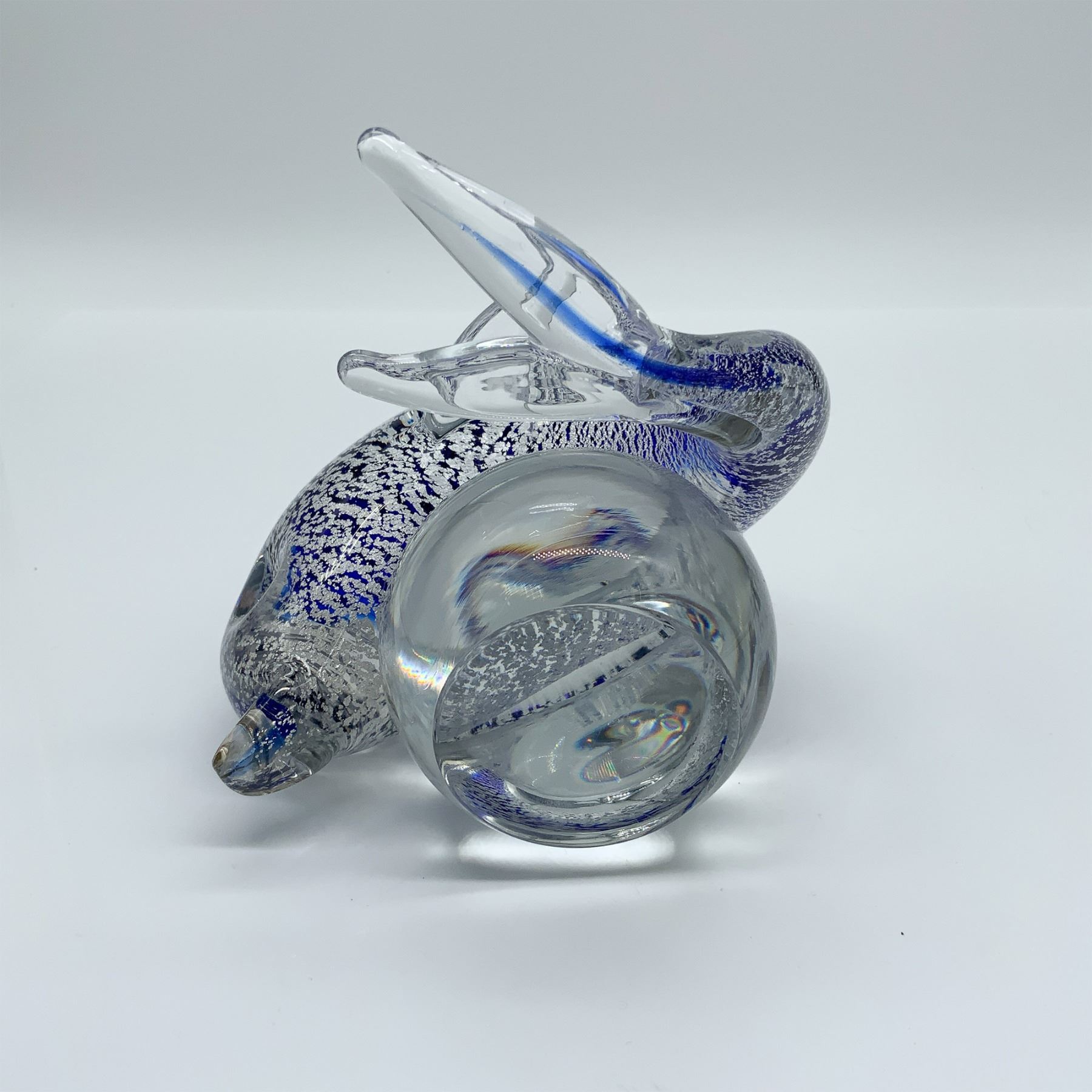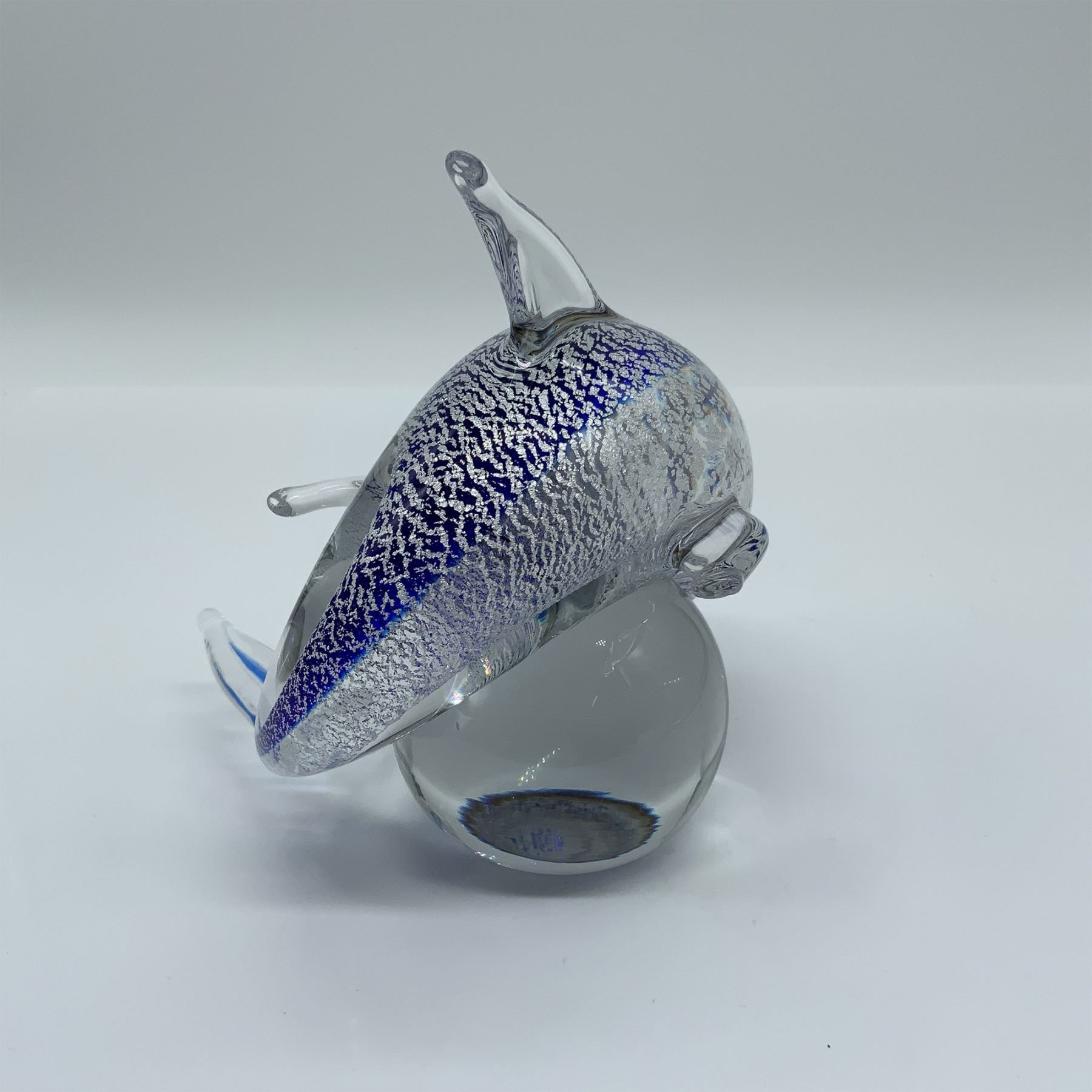 Elegant dolphin paperweight resting on a clear glass sphere. Featuring silver foil inclusions and cobalt blue accents, this piece shimmers with oceanic beauty. Though unsigned, it exhibits fine craftsmanship, making it a striking addition to any collection.
