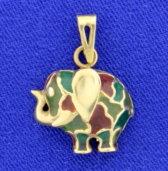 Lovely 14k yellow gold elephant pendant with an art glass design in Green, light green and amber color, very unique…truck is up for good luck! 2.5g NO CHAIN