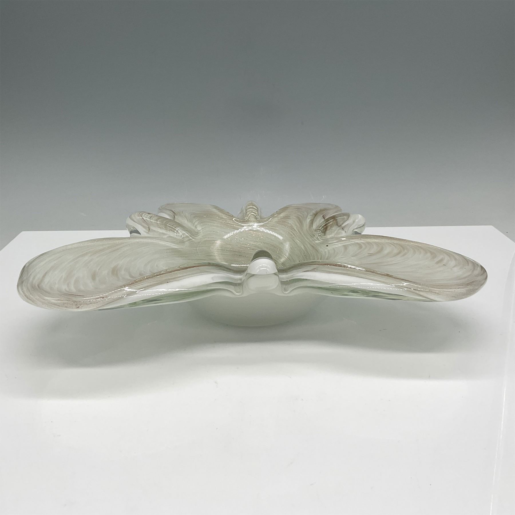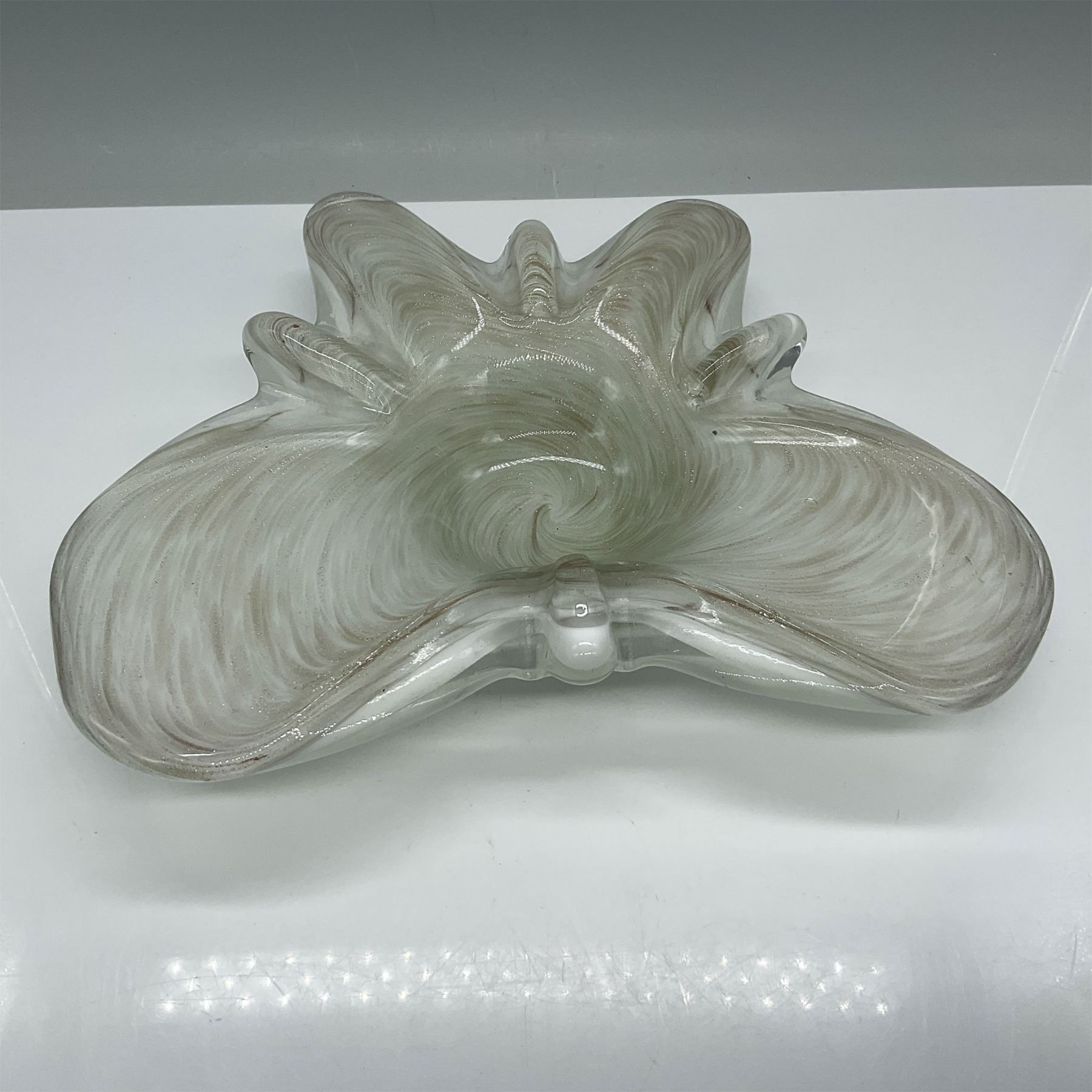 Stunning art glass freeform bowl featuring a delicate swirled pattern in cream and gold flecks. This mid-century inspired piece showcases a scalloped edge and organic form, reminiscent of Venetian glass artistry. Its substantial weight and smooth finish reflect skilled craftsmanship, making it a decorative centerpiece or functional dish.