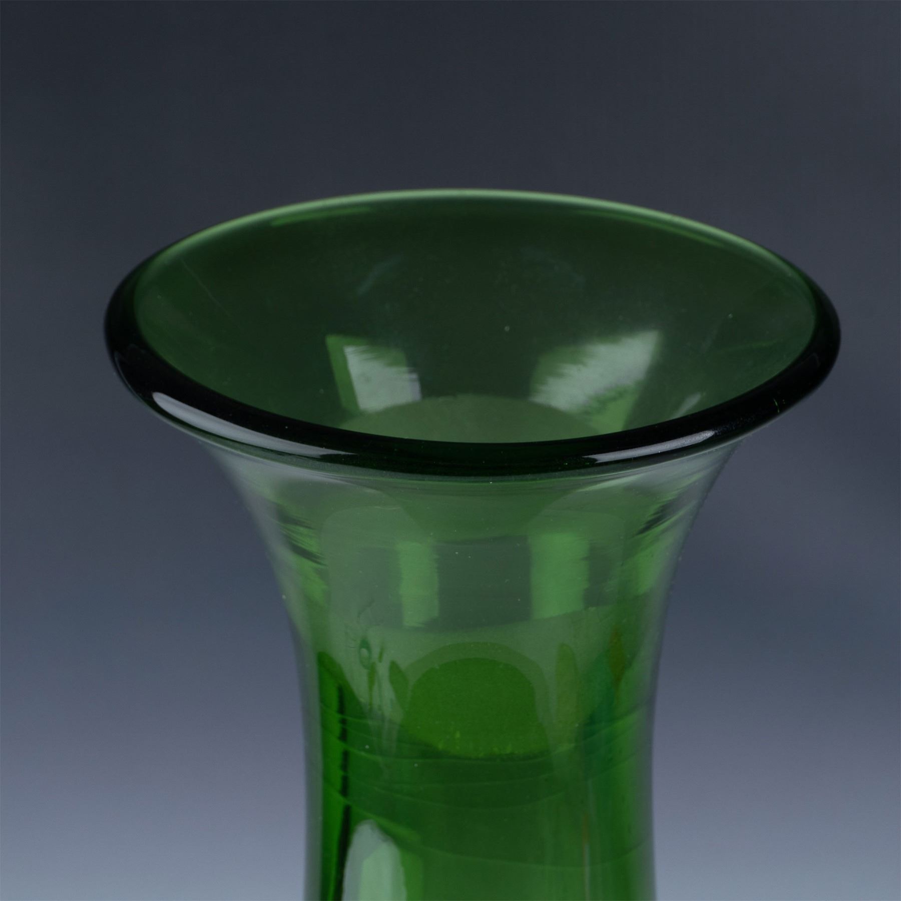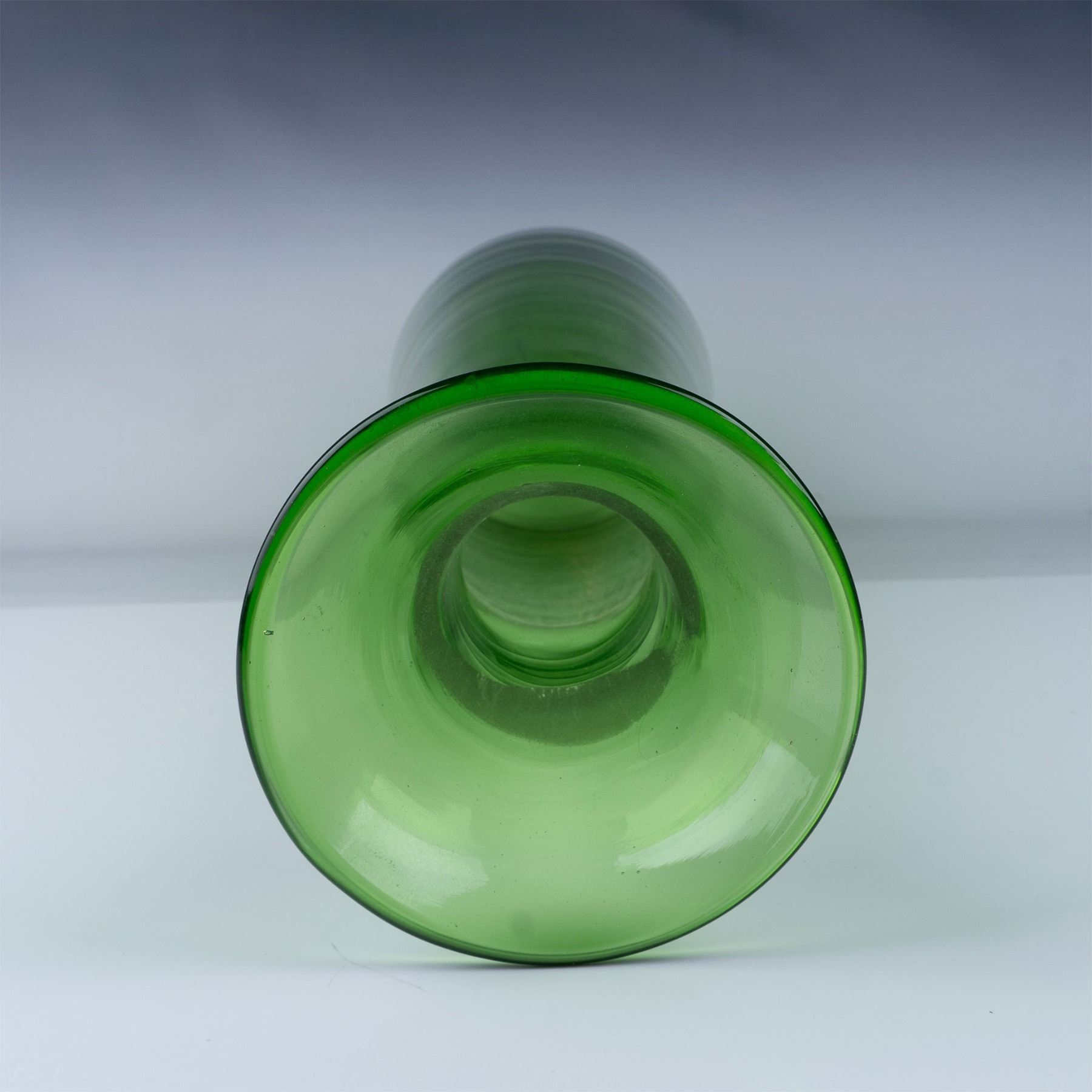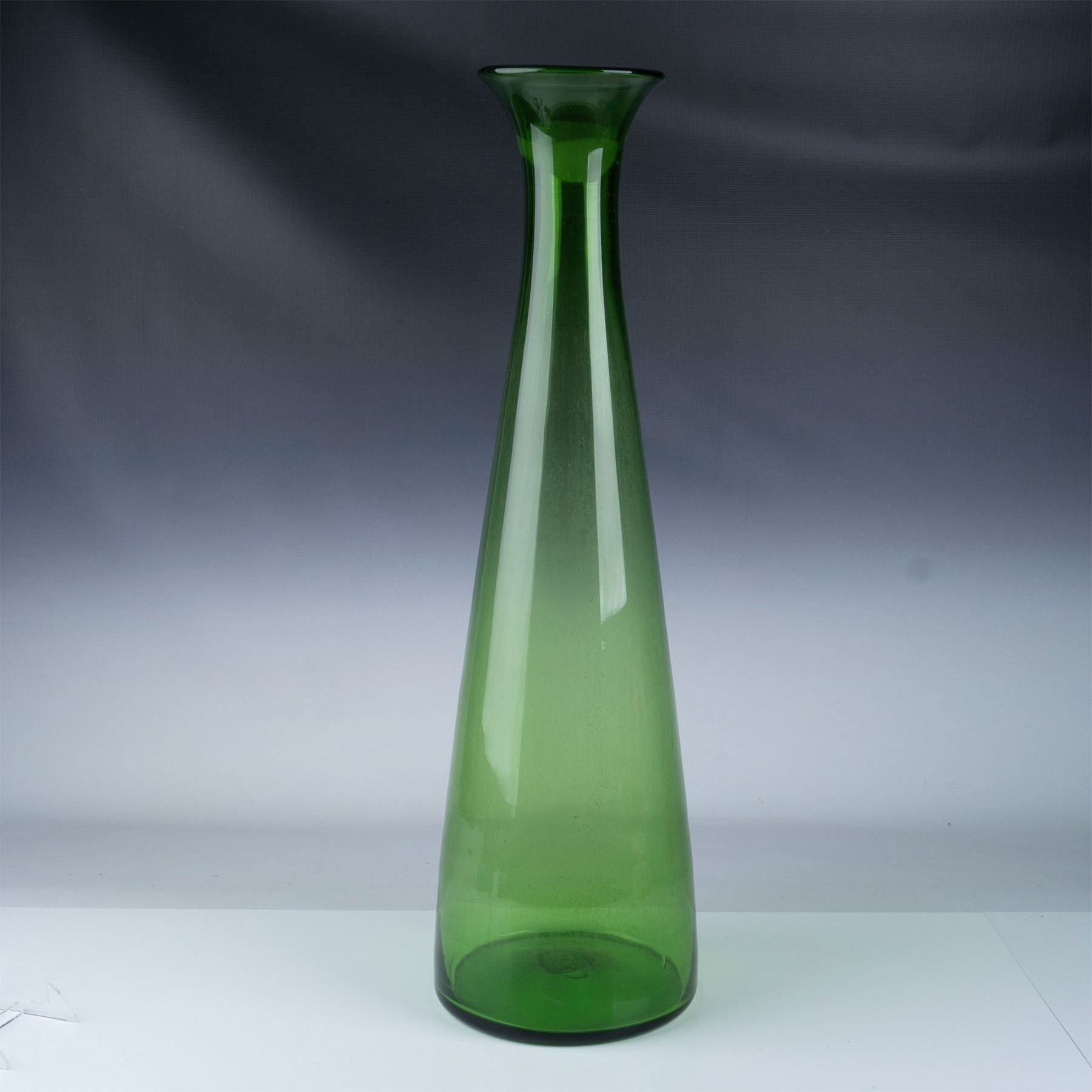 Stunning glass green floor vase featuring a sleek and minimalist design. This mid-century piece showcases a vibrant green color and a flared rim, reflecting Glass craftsmanship and bold use of color. The vase's substantial height makes it an ideal statement piece for any interior decor.