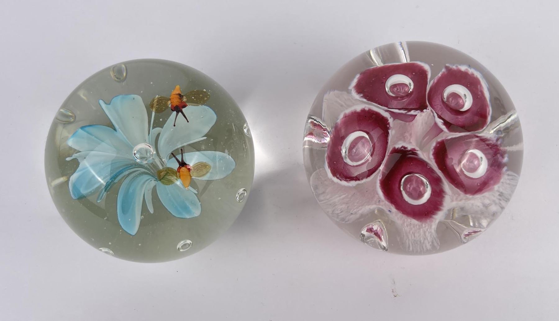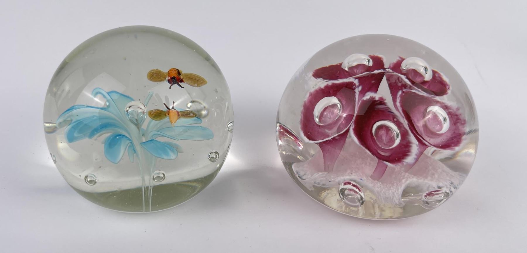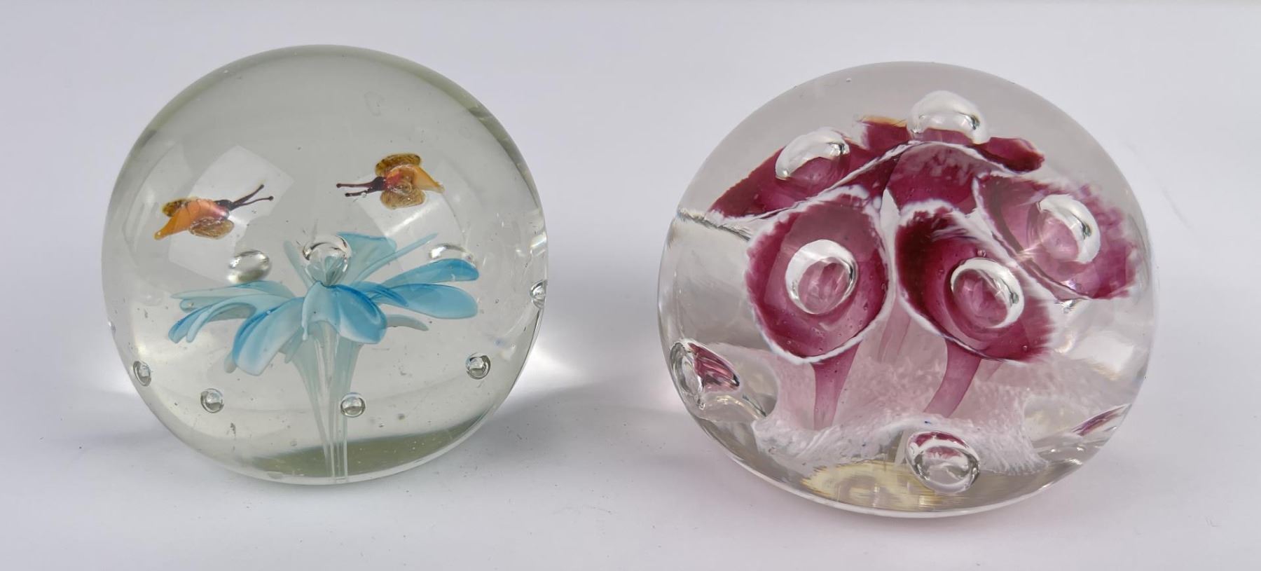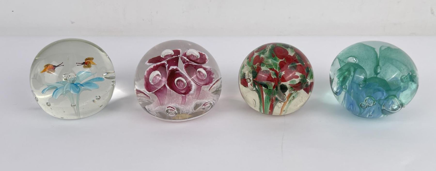 Lot of 4 very nice vintage art glass paperweights. One is Signed Jennings Bonnell, another is signed as shown. Vibrant colors in florals, butterflies and abstract composition.