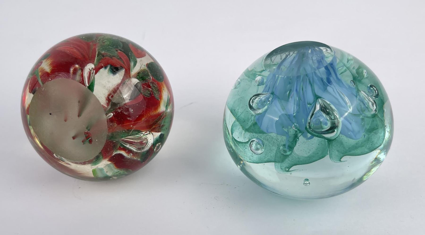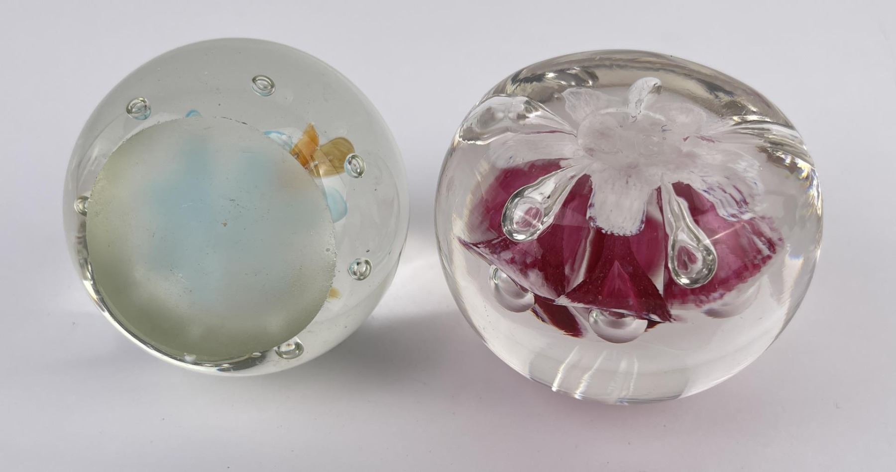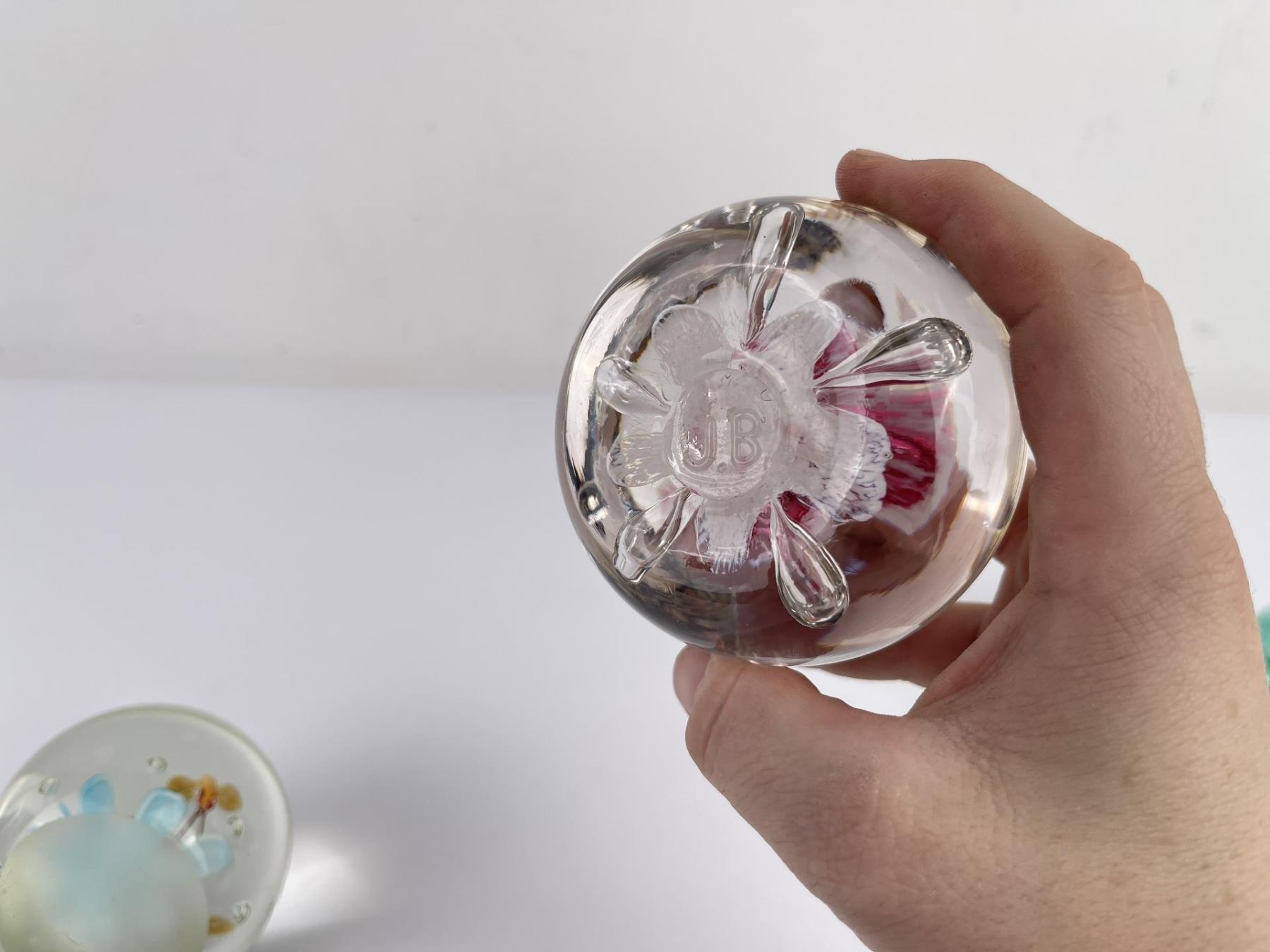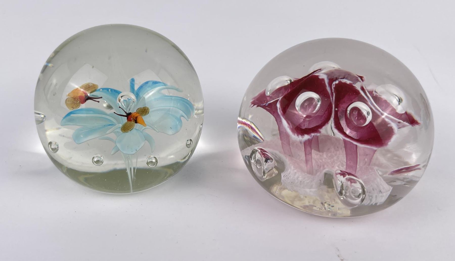 Lot of 4 very nice vintage art glass paperweights. One is Signed Jennings Bonnell, another is signed as shown. Vibrant colors in florals, butterflies and abstract composition.