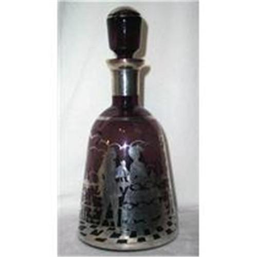 This gorgeous purple hand blown glass decanter features an ornate silver overlay victorian scene surrounding the bottle. Measuring 9" tall with stopper and 4" across the bottom with both the decanter and ground glass stopper in excellent condition