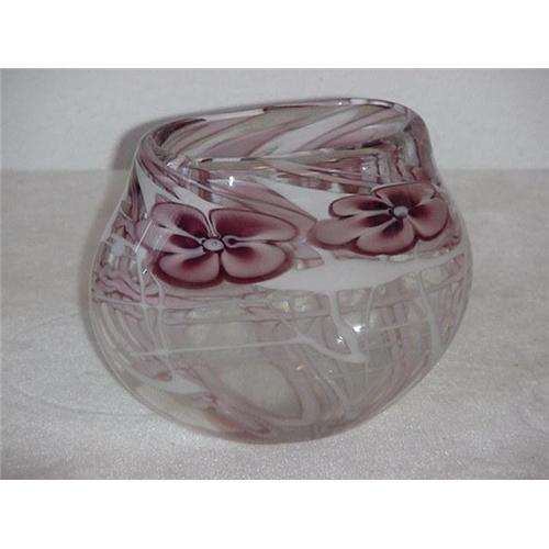 A beautiful art glass vase, 6" tall, 7" long, 3 1/2" wide. The blown vase is decorated with flowers and intermittent white lines through the body of the vase. Dated 3.86 and signed Rich Miller. Condition is very good, no chips or cracks. (4)