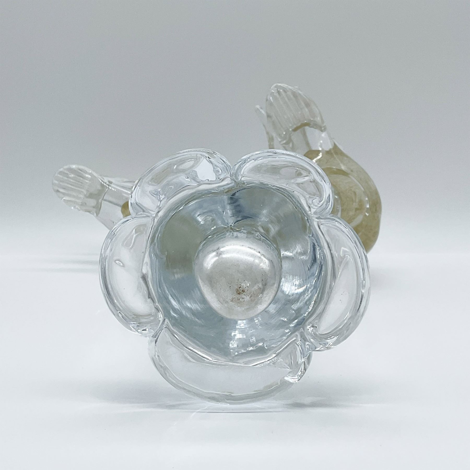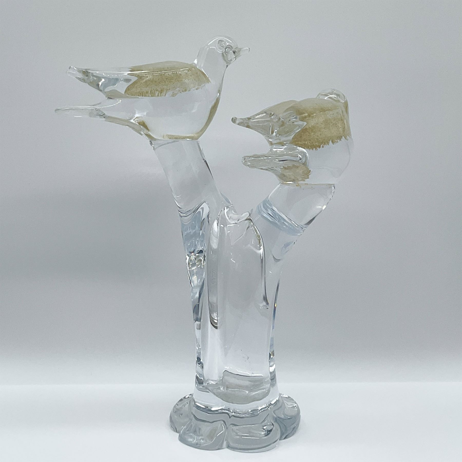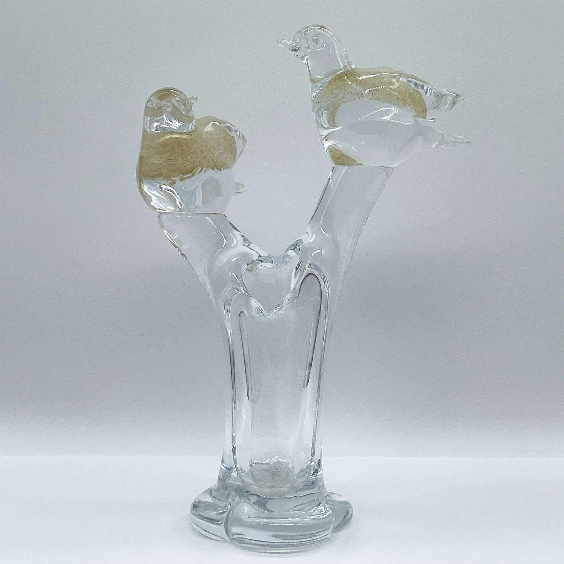 Elegant art glass vase featuring two sculpted birds perched on branching stems. The transparent vase is crafted with smooth, flowing lines, while the birds are adorned with golden-brown accents, showcasing delicate artistry. The polished, smooth base enhances the overall sleek design, adding stability and aesthetic harmony. This vase is both functional and decorative, ideal for floral arrangements or as a striking standalone piece. Unsigned. A perfect addition to any art glass collection.