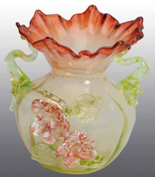 Description Cranberry top with Vaseline glass bottom. Two small pieces of applied glass are missing near handle bottoms. Condition (Excellent). Size 5 - 1/2" T.