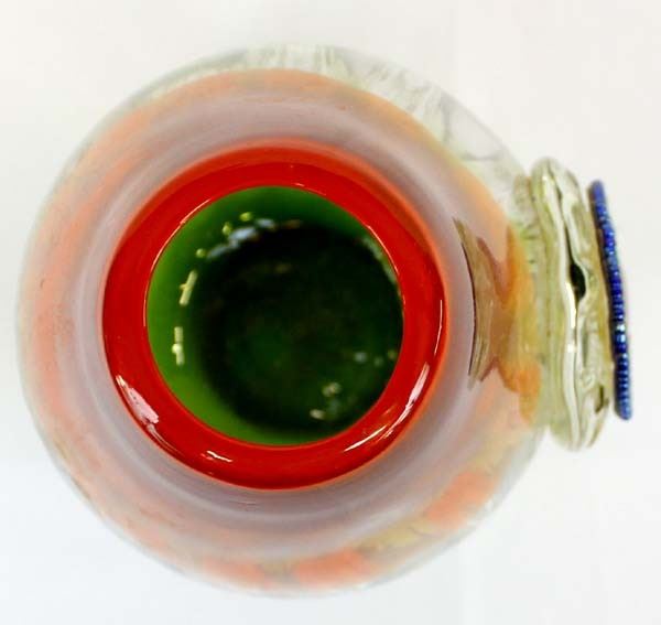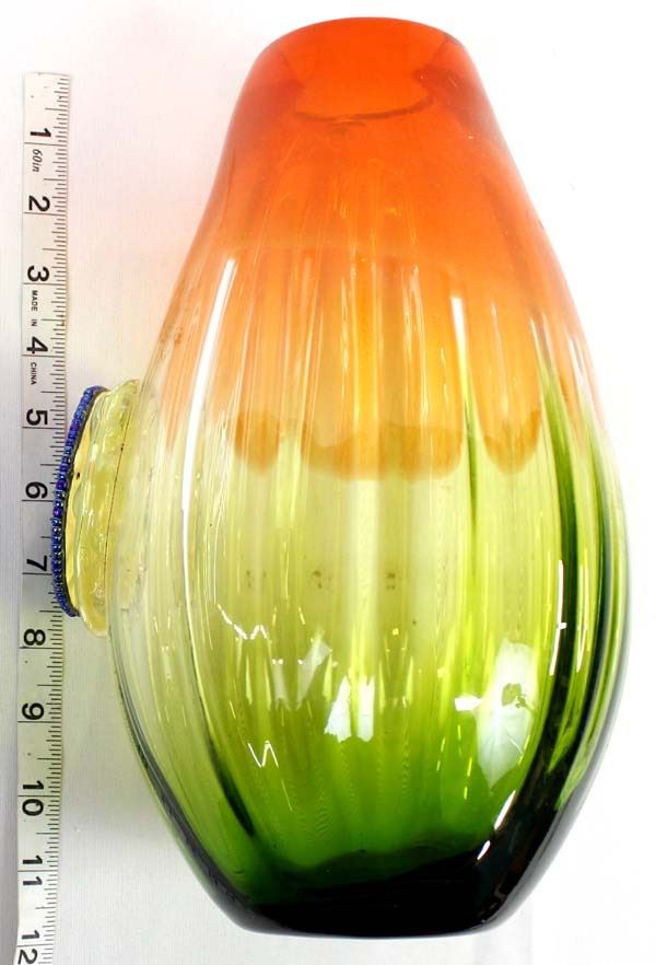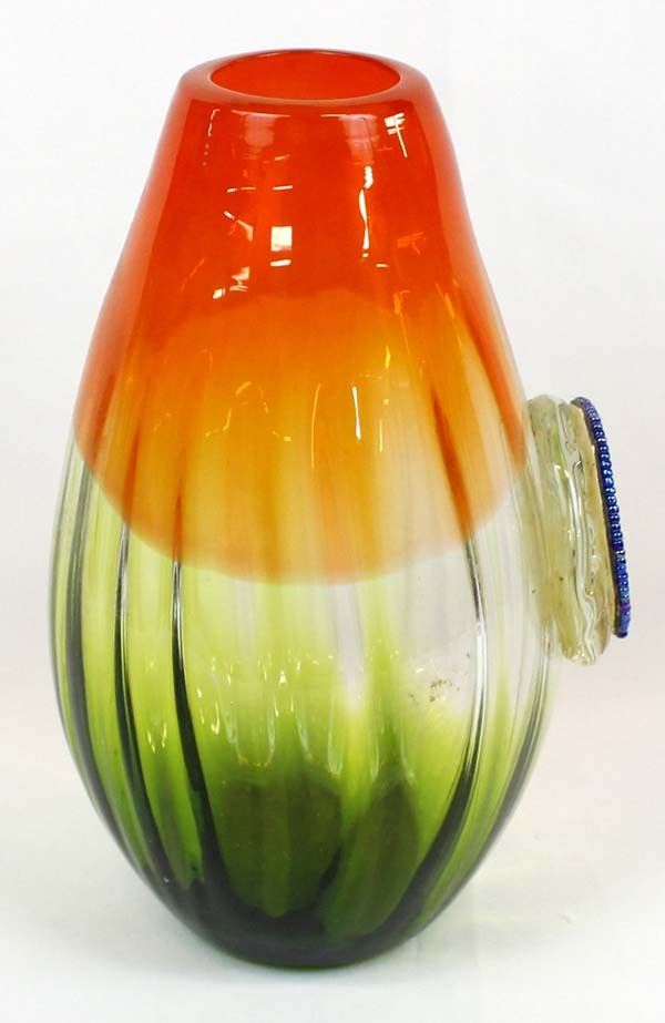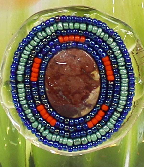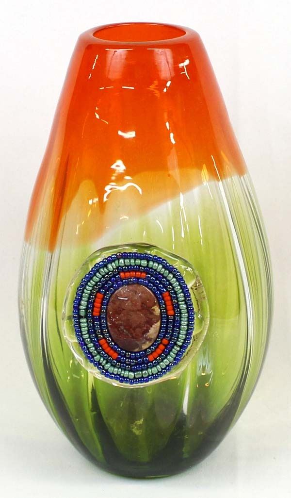 Art Glass Vase with Bead and Stone Medallion by Kathy Kills Thunder, beautiful iridescent beaded medallion with agate focal, measures 6'' x 11''