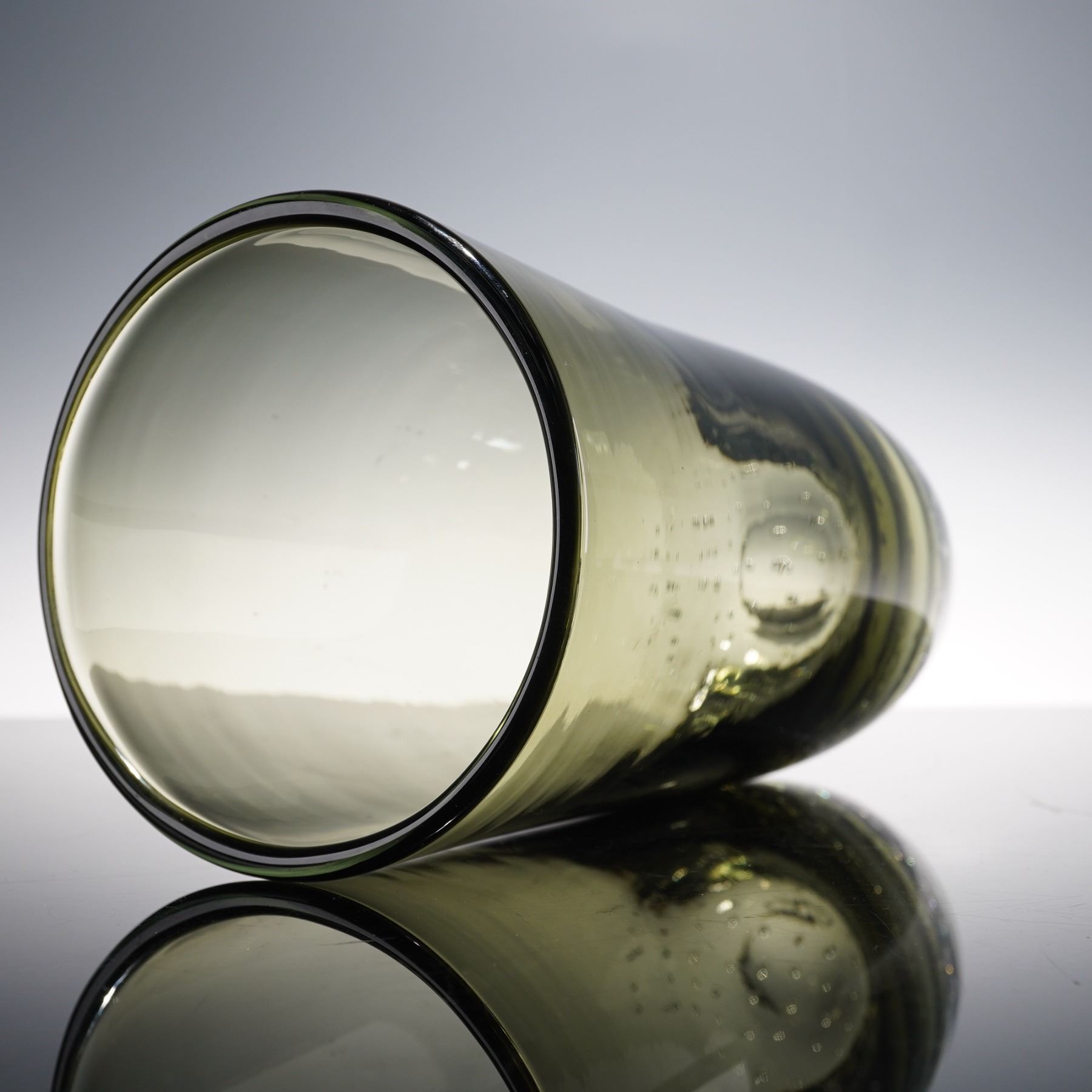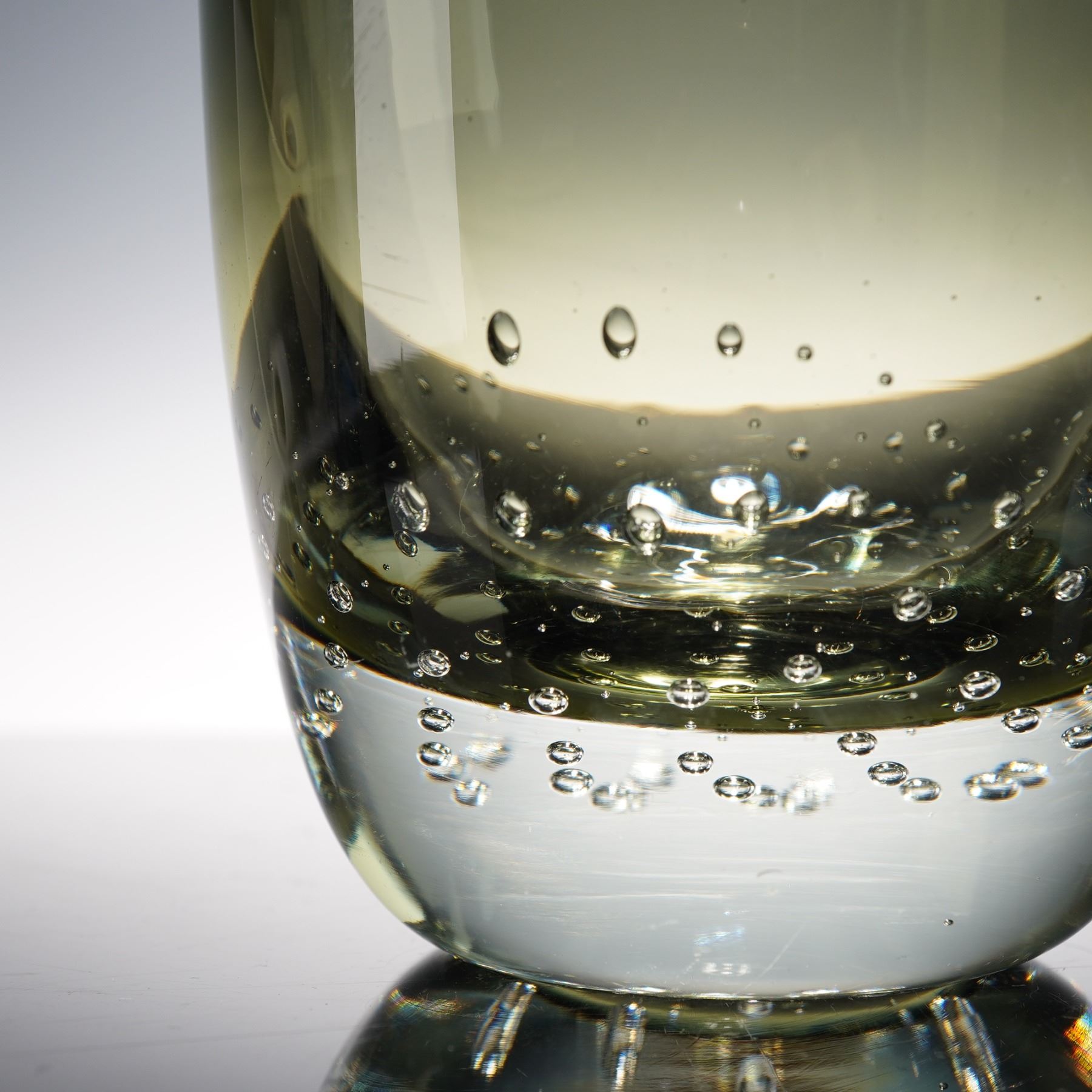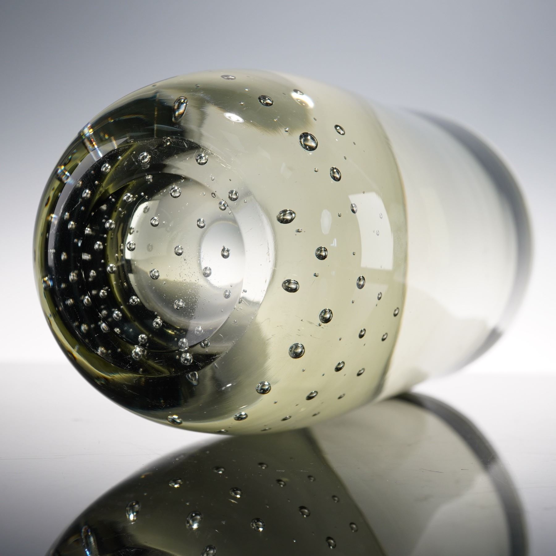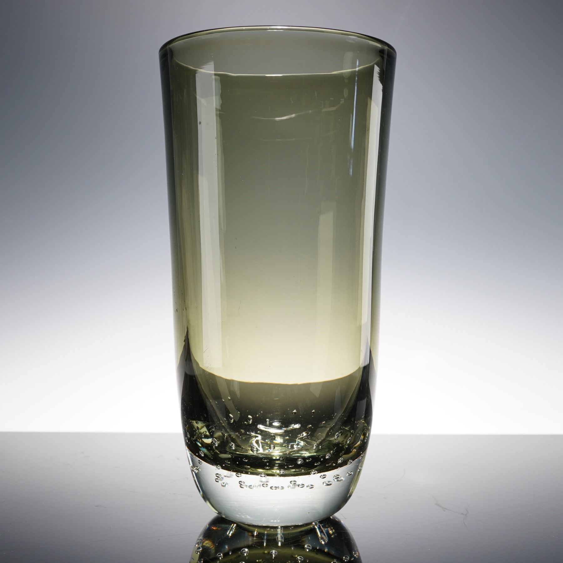 Erickson style tall art glass vase, featuring a thick clear base filled with uniform controlled bubbles and a smoky tinted cylindrical body. Elegant mid-century form, ideal for floral display or as a sculptural decorative piece.