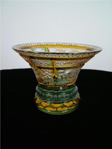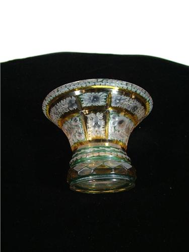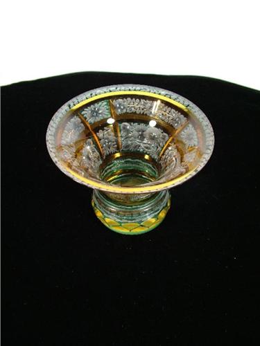(American 19304 -40s) Etched art glass with dark green and yellow flower etchings, 4 1/2" by 6"