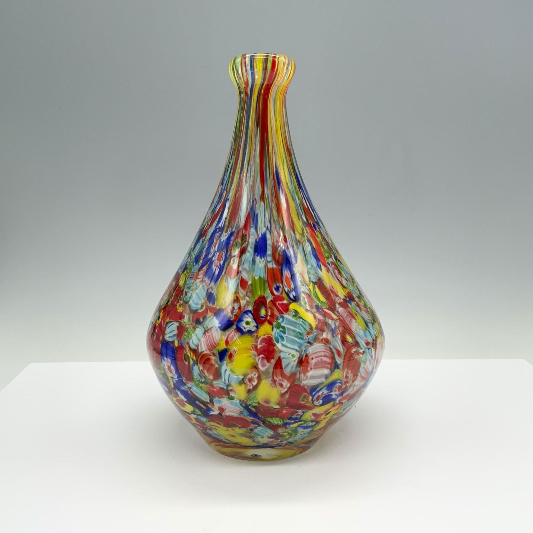 This colorful piece showcases a harmonious blend of vibrant colors, with rich tones of golden yellow and red orange flowing seamlessly throughout the body of the vase. Ideal for display or as a centerpiece.