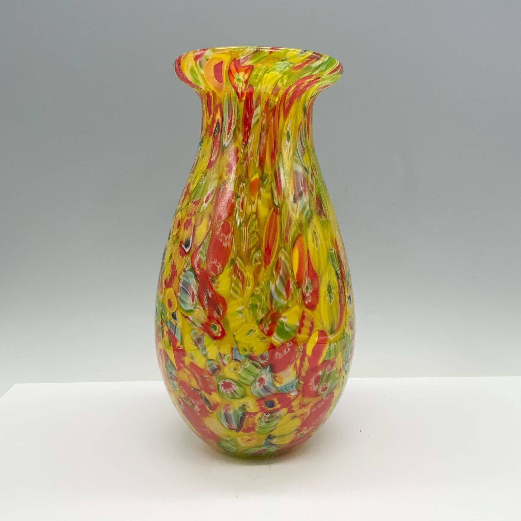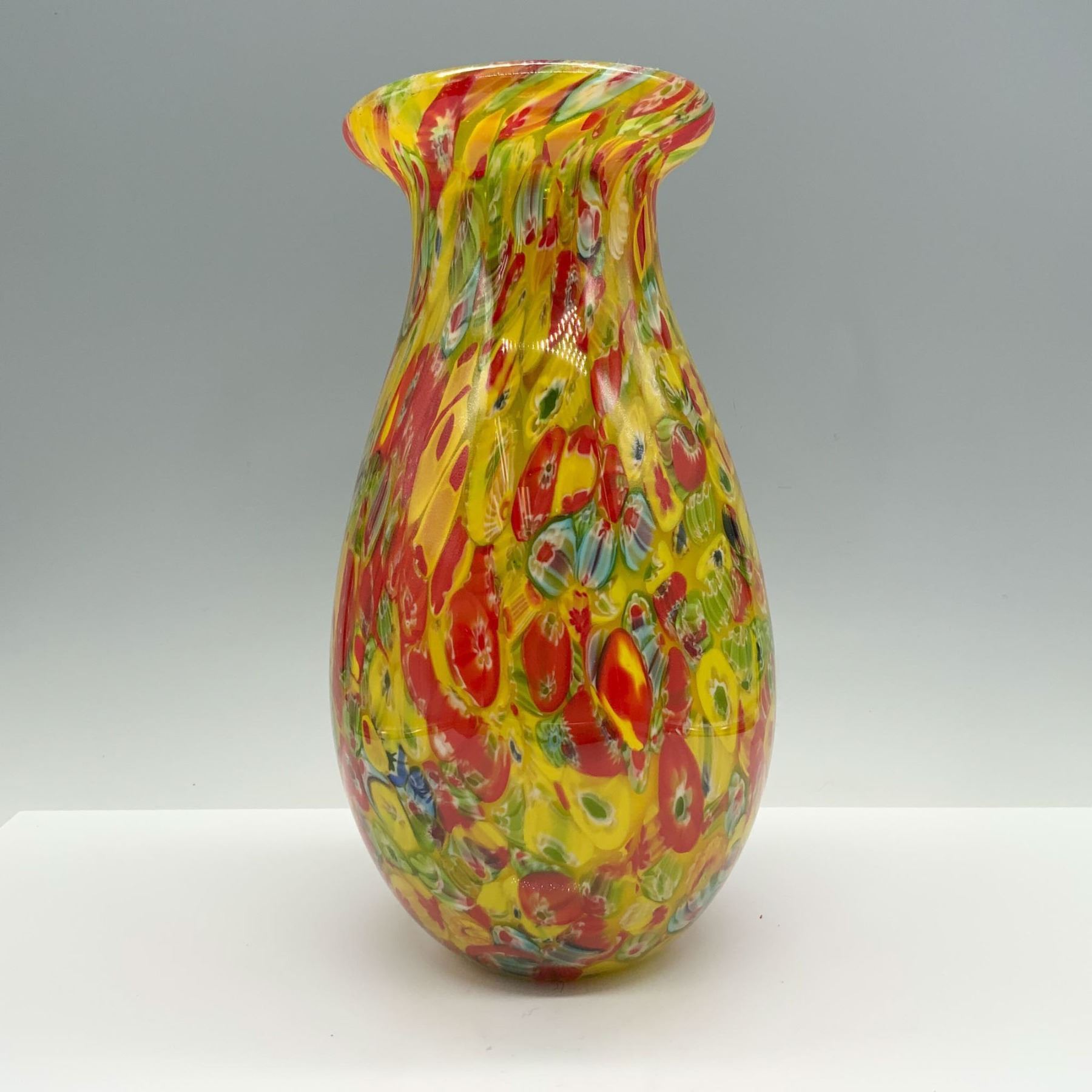 This colorful piece showcases a harmonious blend of vibrant colors, with rich tones of golden yellow and red orange flowing seamlessly throughout the body of the vase. Ideal for display or as a centerpiece.