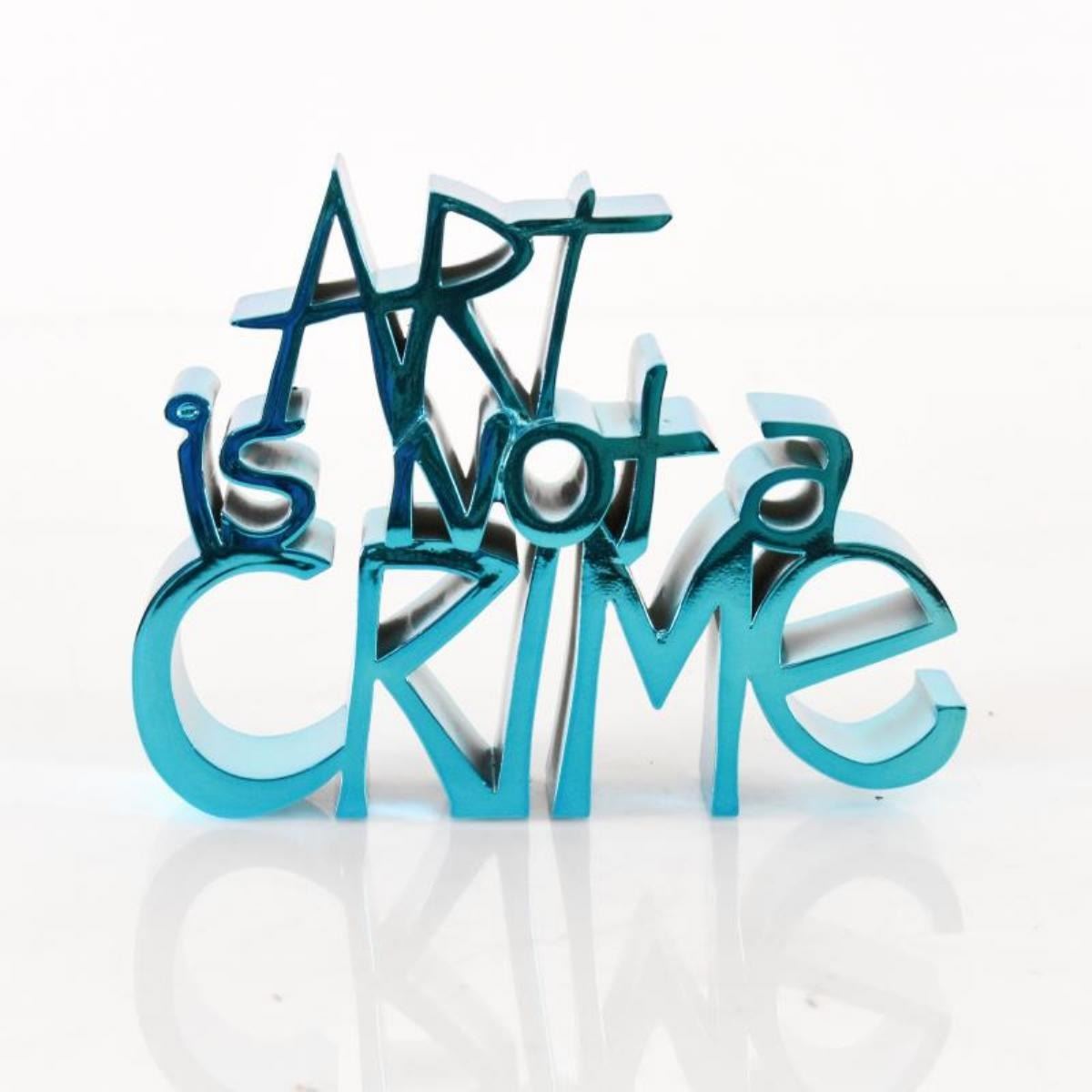 "Art Is Not a Crime (Chrome Blue)" is a limited edition resin sculpture by Mr. Brainwash, numbered and hand signed by the artist. Includes Certificate of Authenticity. Measures approx. 8" x 6.5" x 2".