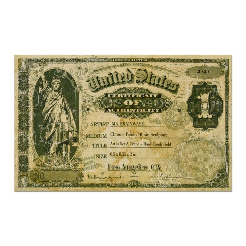 "Art Is Not a Crime (Gold)" is a limited edition resin sculpture by Mr. Brainwash, numbered and hand signed by the artist. Includes Certificate of Authenticity. Measures approx. 8" x 6.5" x 2".
