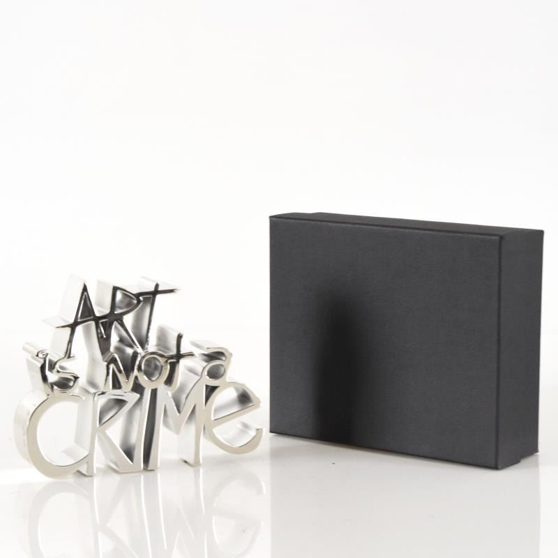 "Art Is Not a Crime (Silver)" is a limited edition resin sculpture by Mr. Brainwash, numbered and hand signed by the artist. Includes Certificate of Authenticity. Measures approx. 8" x 6.5" x 2".