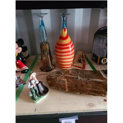 Blue glass tea light glass holders, can be turned upside down 14” Yellow orange striped vase, B.C. Ocean Picture Rock Clock, multi coloured v