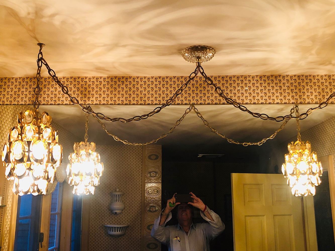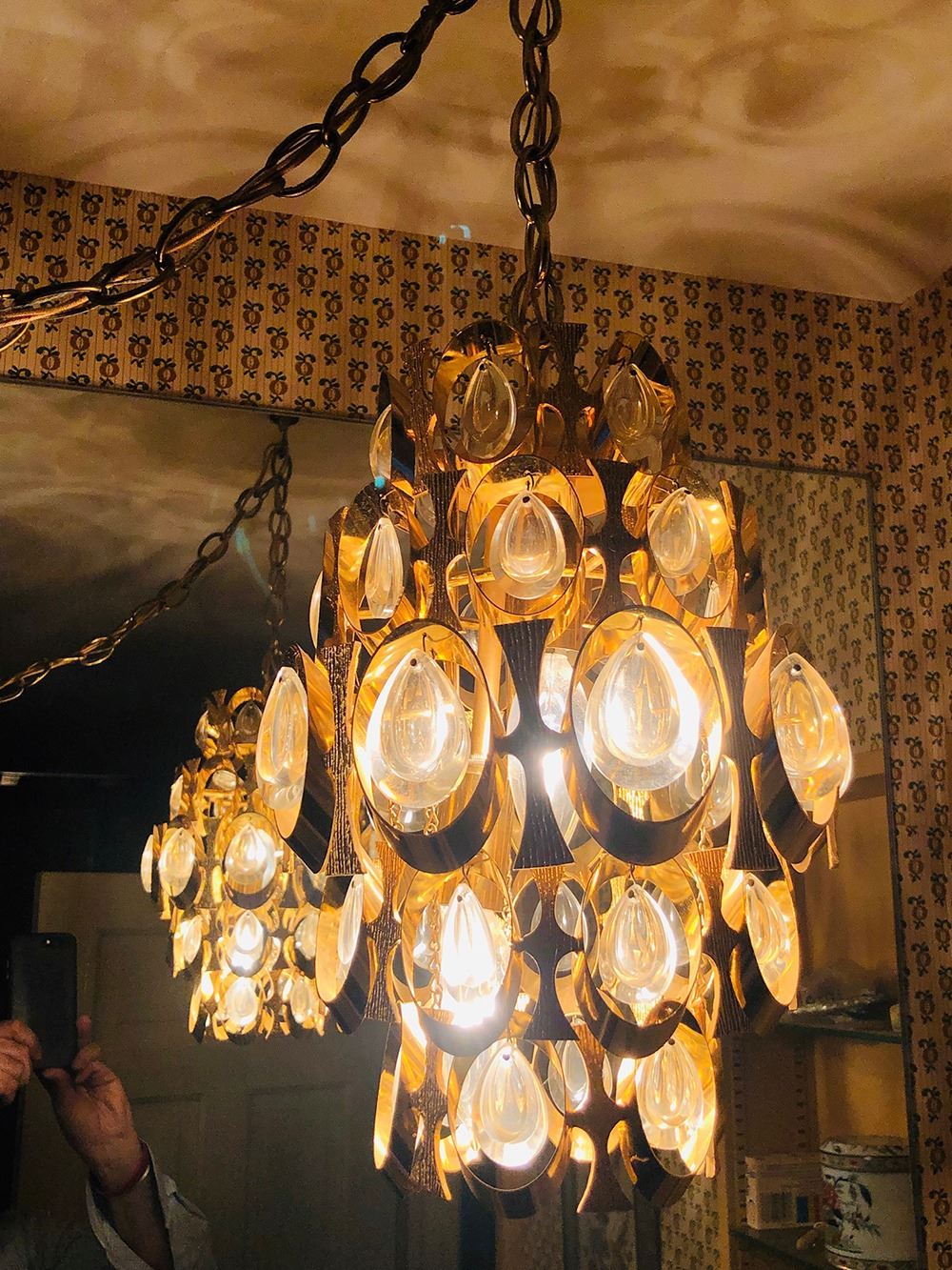 Art Modern double hanging lamps, crystals in gold tone ovals, 2 hanging chandeliers on one fixture with chains.