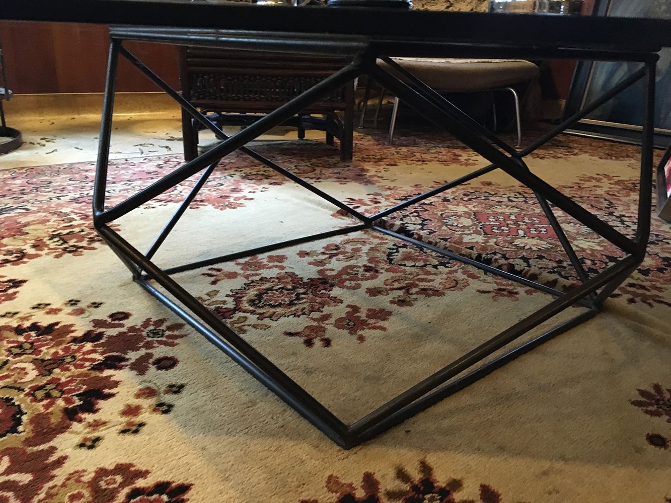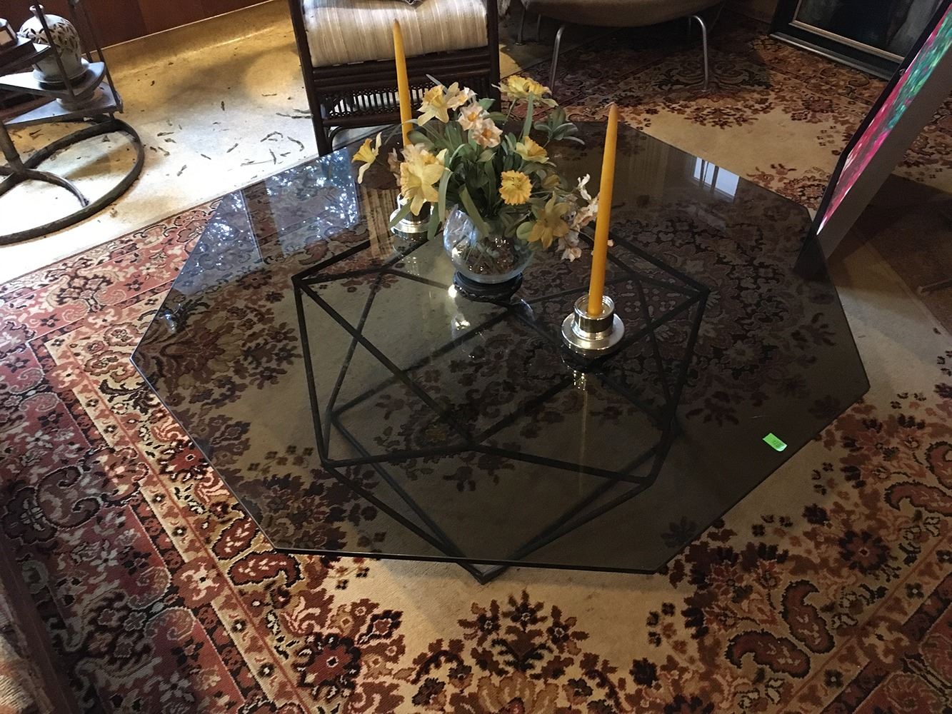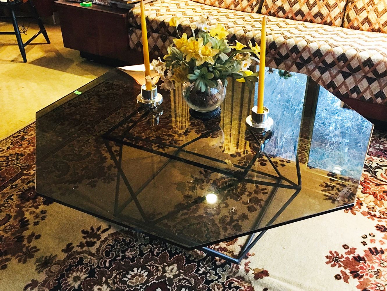 Art Modern Smoke Glass Coffee Table, hexagon shaped, on cast metal base. pd