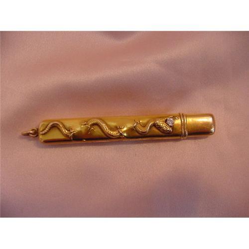 Very finely crafted 14K etui with snake motif on each side. On one side the snake has a beautiful diamond in it's mouth. Diamond is a .15 carat Old European Cut VS/GH. There is a scripted monogram on side edge. Measures 3 1/4" long, 1/4" wide, and approximately 3/16" deep. Marked 14K B 15. Makes a great and interesting necklace. Long 18K antique chain available upon request. Circa 1900. Excellent condition.