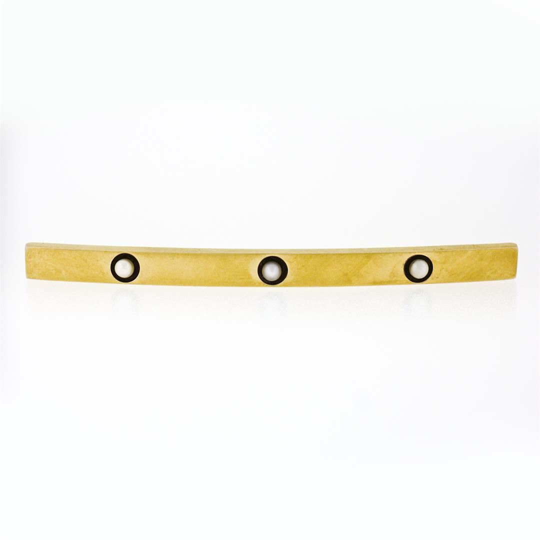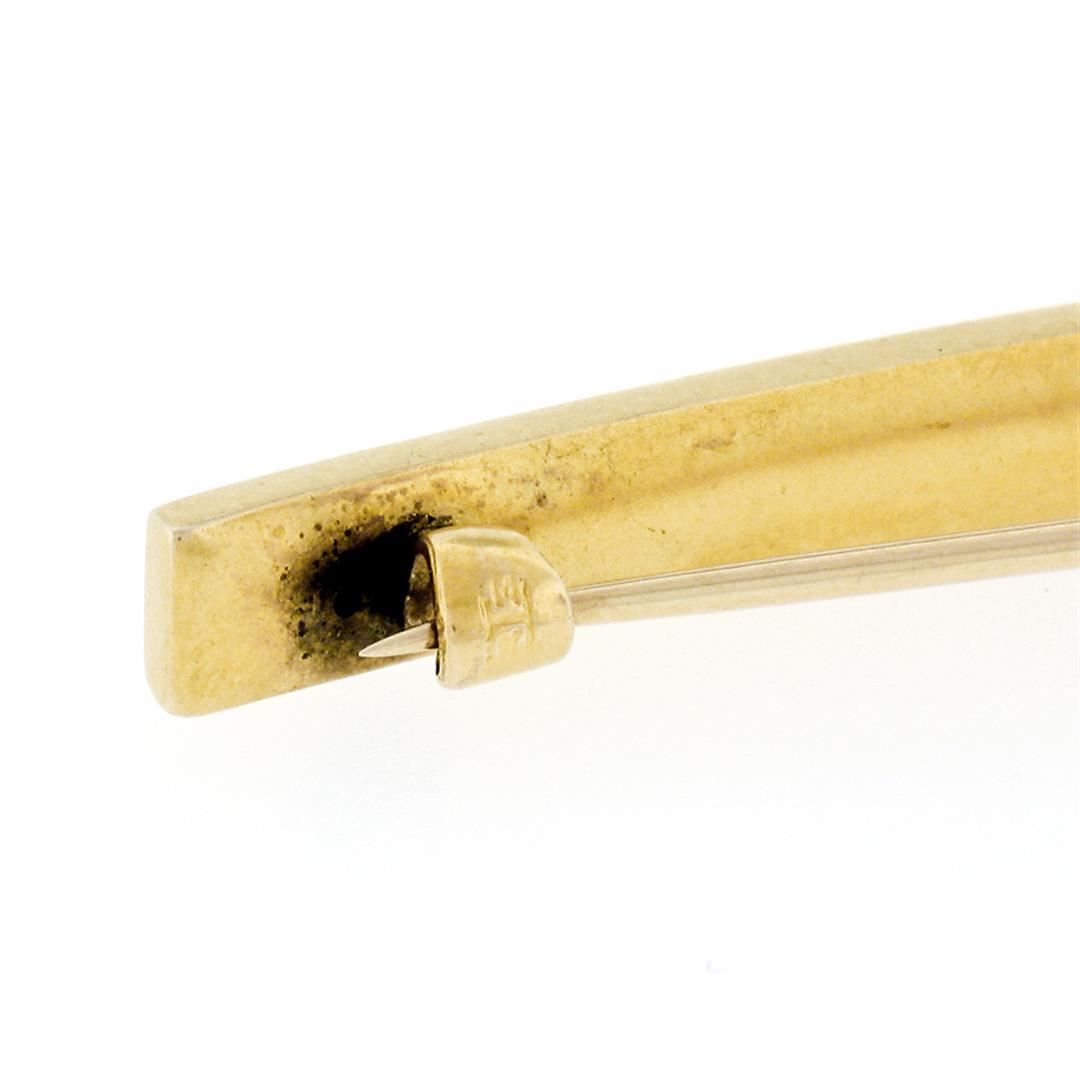 An art nouveau period 14k yellow gold bar pin featuring 3 natural round seed pearls (2.5mm). Measures 63.1x4.8mm and weighs a total of 3.98 grams.