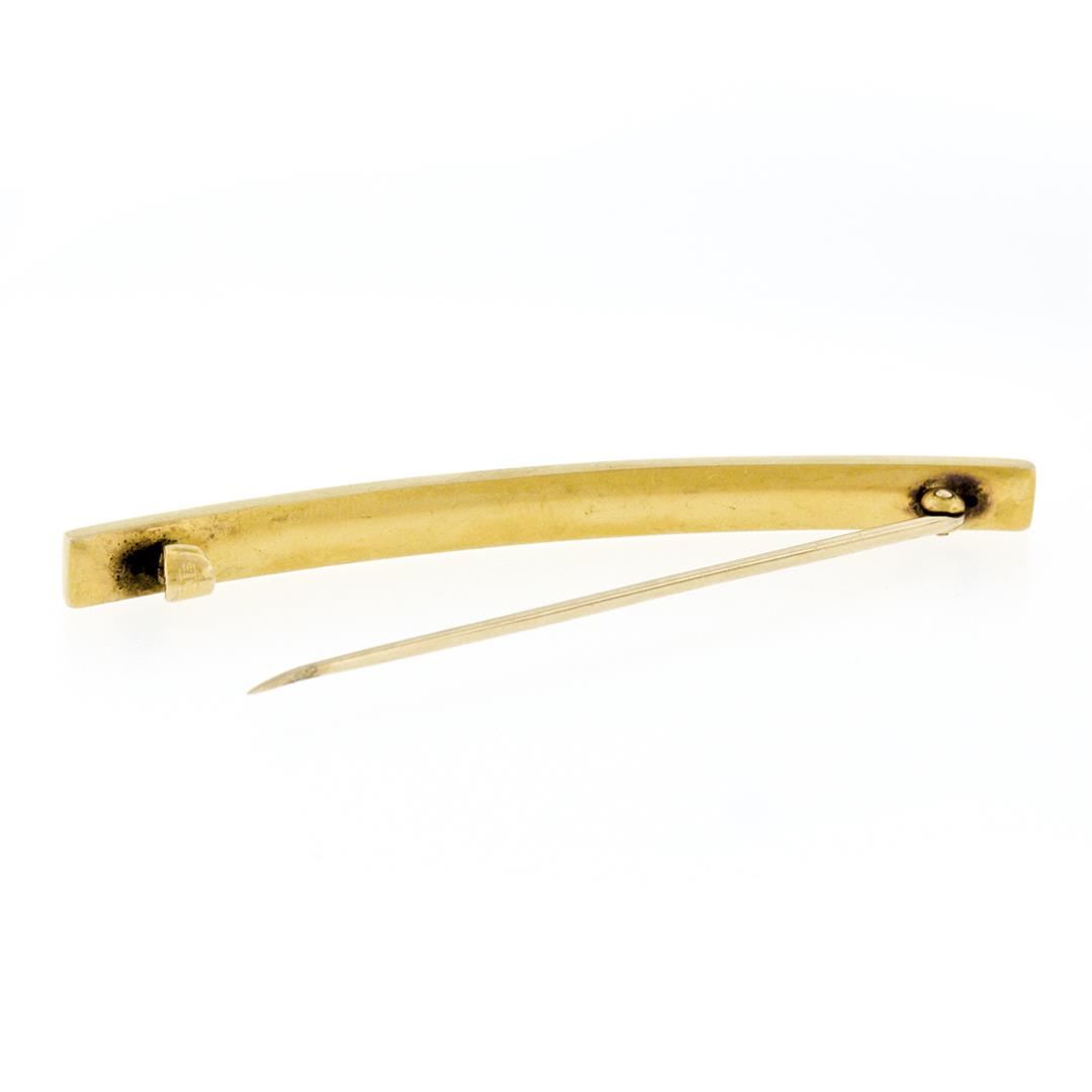 An art nouveau period 14k yellow gold bar pin featuring 3 natural round seed pearls (2.5mm). Measures 63.1x4.8mm and weighs a total of 3.98 grams.