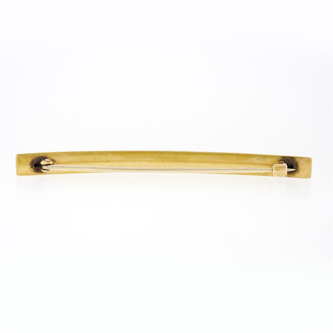 An art nouveau period 14k yellow gold bar pin featuring 3 natural round seed pearls (2.5mm). Measures 63.1x4.8mm and weighs a total of 3.98 grams.