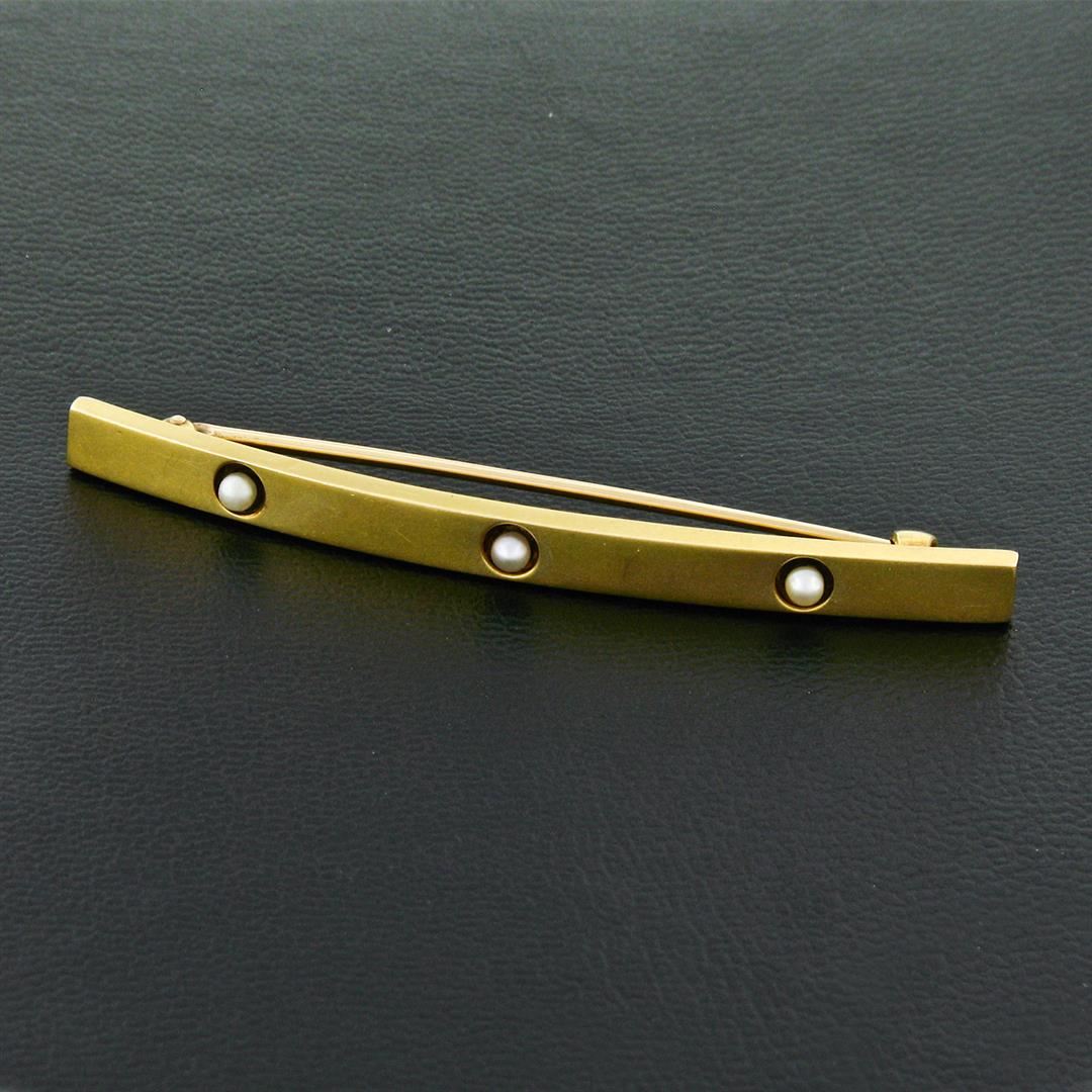 An art nouveau period 14k yellow gold bar pin featuring 3 natural round seed pearls (2.5mm). Measures 63.1x4.8mm and weighs a total of 3.98 grams.