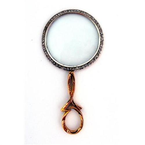 This ornate(unmarked)gold and silver quizzing glass displays distinctive Art Nouveau motifs. The glass is set in a slim circular silver frame prong-set with rose-cut diamonds. The backing is gold with discreet decorative motifs. The diamonds and silver of the glass frame are smartly complimented by the curvaceous gold handle featuring swirling Art Nouveau leaf motifs.