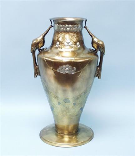 Art Nouveau - An unusual Austrian gold and silver patinated metal vase with two peacock form handles. The neck is relief decorated with silver toned fruit designs. Circa 1900. 21" high.