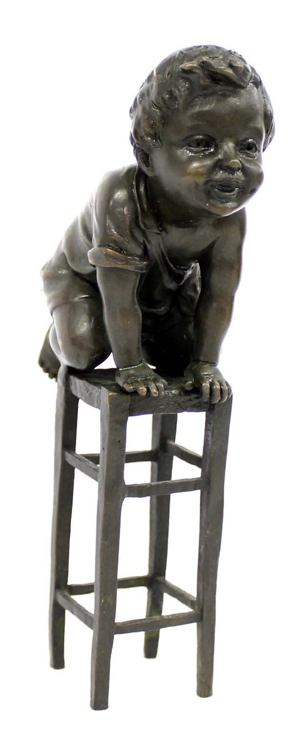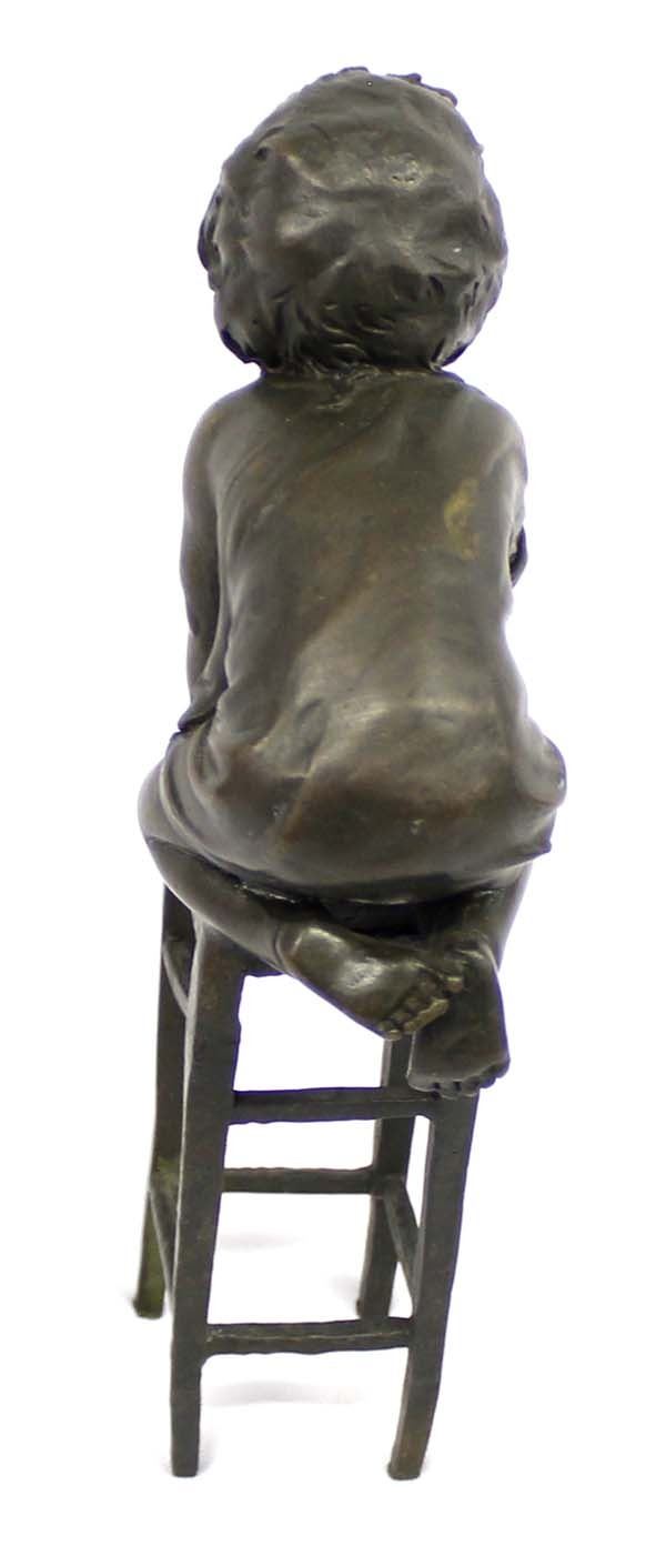 Art Nouveau Bronze Restrike Boy on Stool by Spanish Artist Juan Clara (1875-1958), signed on bottom, measures 8.25''High x 3''Deep x 2''W