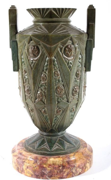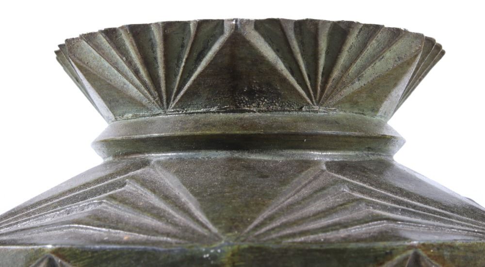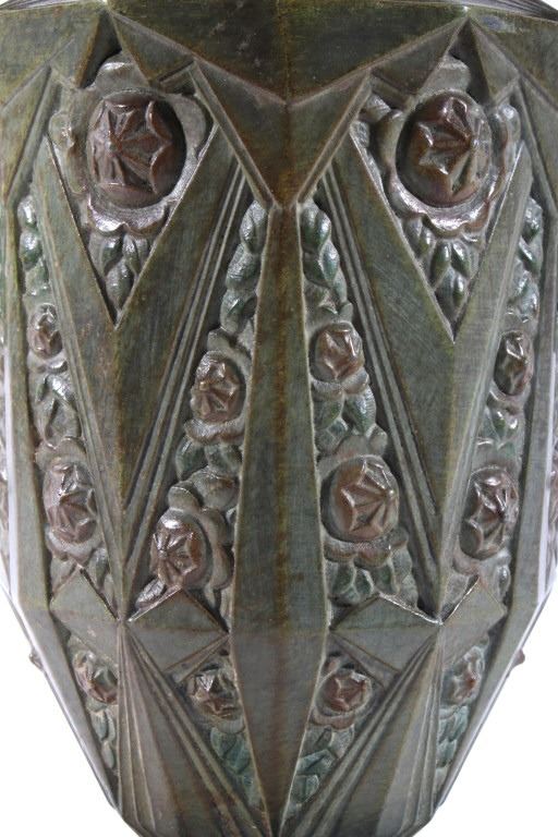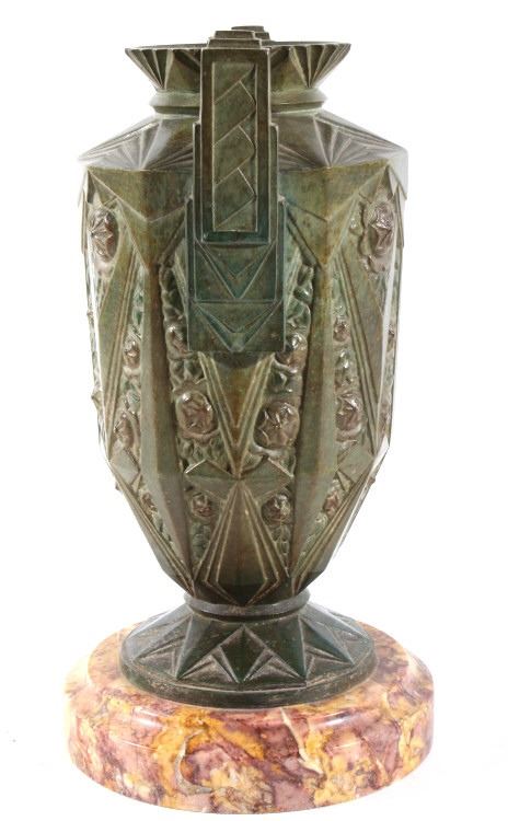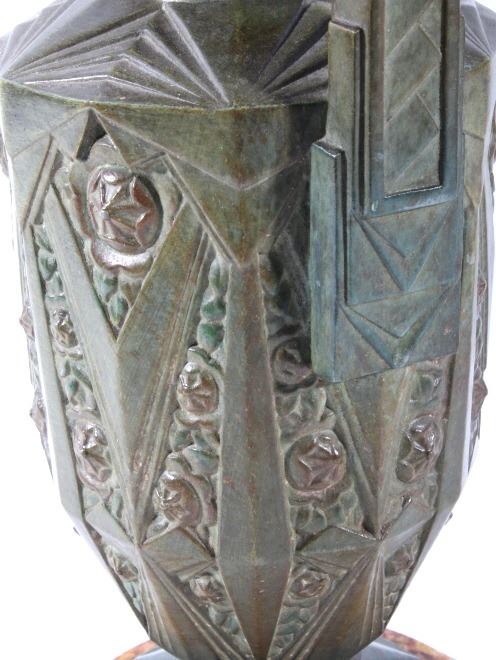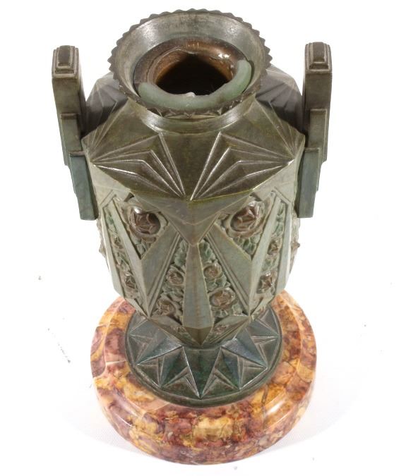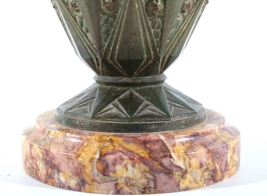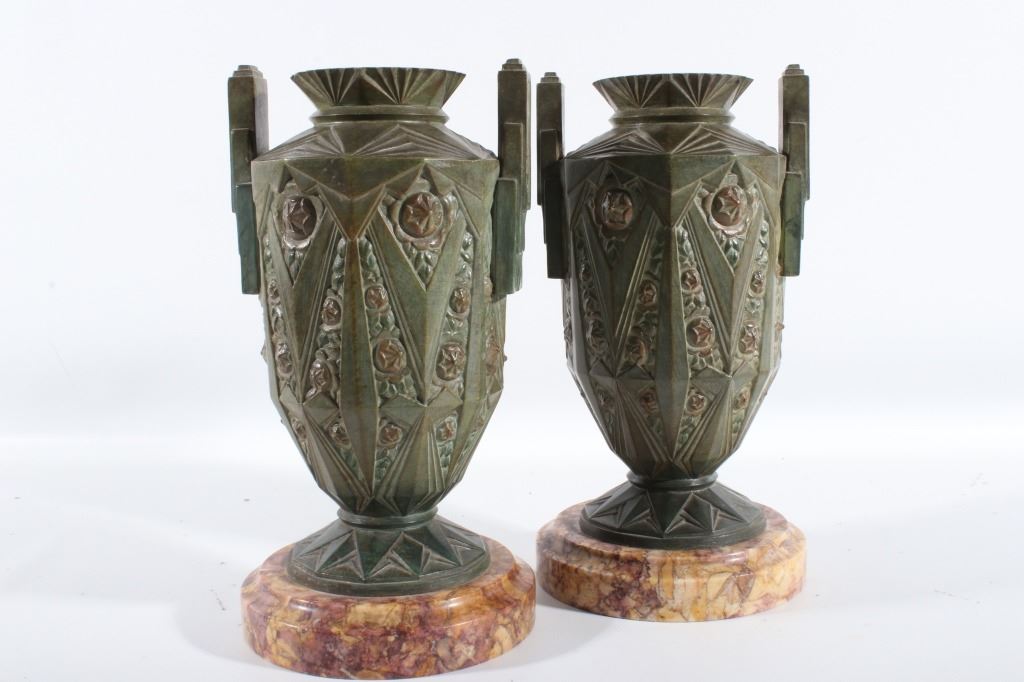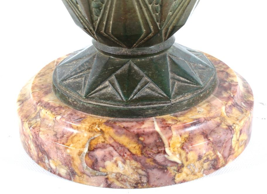 Offered in this lot we have a set of two Art nouveau bronze candleholders for the late 19th century to the early 20th century. The candleholders are constructed out of a single piece of bronze with a granite or marble base. The pieces shows wonderful angular geometric patterns with floral patterns in between sections. These are beautiful pieces and show good condition with little to no signs of wear. Both of the candle holders measure 10 1/2" tall with a base diameter of 5 1/2".