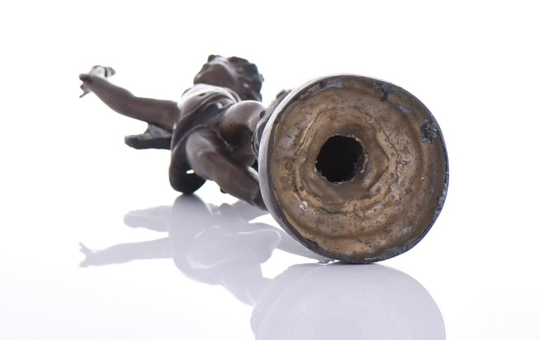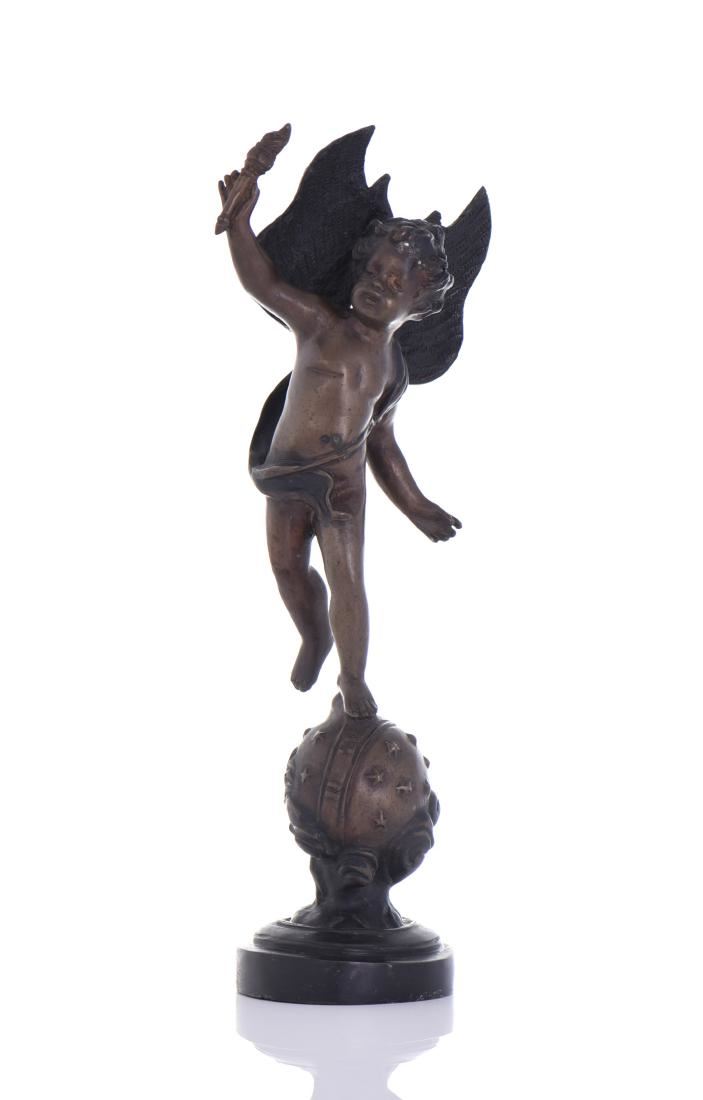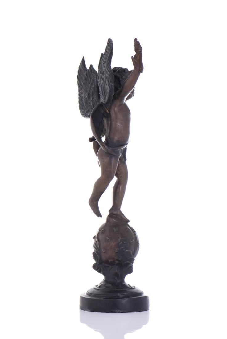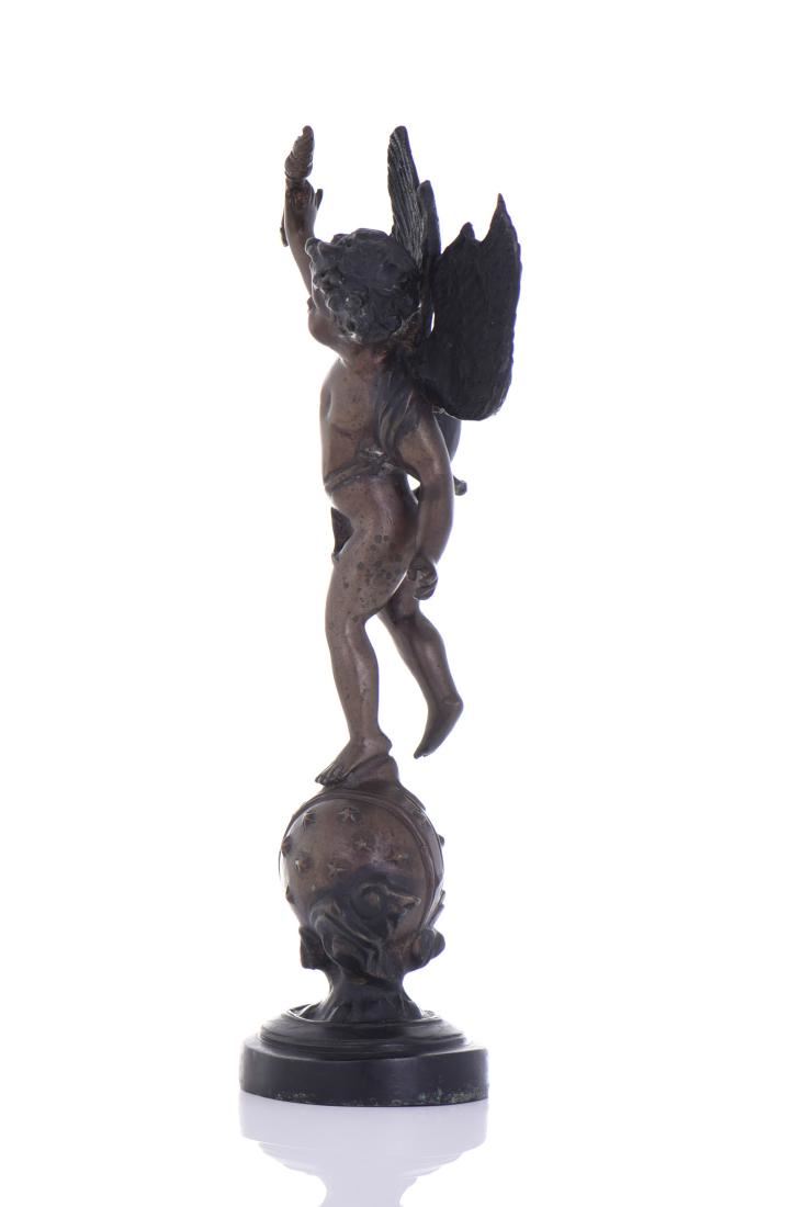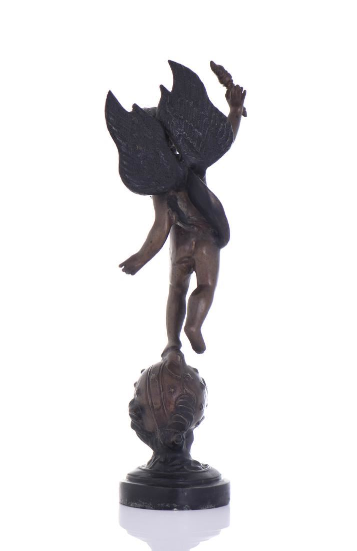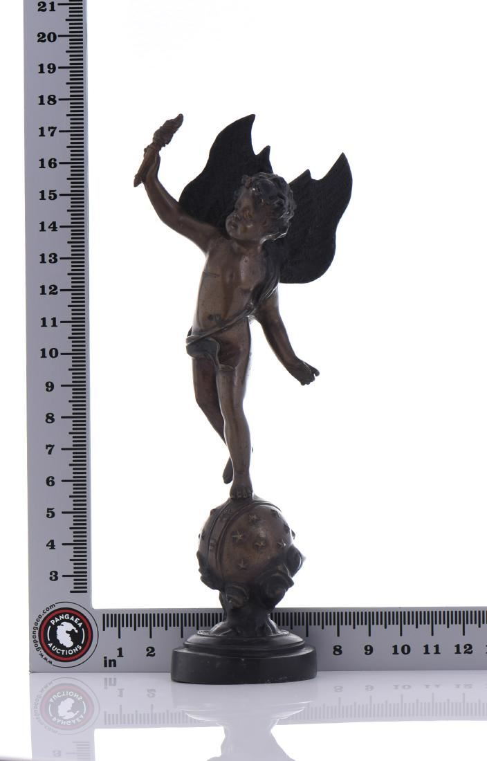 Art Nouveau Bronze Cherub Sculpture Holding A Torch Standing Atop Of A Globe Signifying A Symbol Of Light Ahead Estimated more than 100 yrs old. The use of bronze dates from remote antiquity. This important metal is an alloy composed of copper and tin, in proportion which vary slightly, but may be normally considered as nine parts of copper to one of tin. The result is a metal of a rich golden brown color, capable of being worked by casting a process little applicable to its component parts, but peculiarly successful with bronze, the density and hardness of the metal allowing it to take any impression of a mold, however delicate. It is thus possible to create ornamental work of various kinds. The process of casting is known as cire perdue, and is the most primitive and most commonly employed through the centuries, having been described by the monk Theophilus, and also by Benvenuto Cellini. Briefly, it is as follows: a core, roughly representing the size and form of the object to be produced, is made of pounded brick, plaster or other similar substance and thoroughly dried. Upon this the artist overlays his wax, which he models to the degree required in his finished work. Passing from the core through the wax and projecting beyond are metal rods. The modelling being completed, the outer covering which will form the mold has to be applied this is a liquid formed of clay and plaster sufficiently thin to find its way into every detail of the wax model. Further coatings of liquid are applied, so that there is, when dry, a solid outer coating and a solid inner core held together by the metal rods, with the work of art modelled in wax between. Heat is applied and the wax melts and runs out, and the molten metal is poured in and occupies every detail which the wax had filled. When cool, the outer casing is carefully broken away, the core raked out as far as possible, the projecting rods are removed and the object modelled in wax appears in bronze. If further finish is required, it is obtained by tooling. (Wikipedia) Size and weight is provided in the last photo of this lot if not written within the lot description. All photos represent the lot condition and may contain unseen imperfections in addition to the information provided. All items are described to the best of our abilities. Please communicate all questions and concerns prior to bidding. Please read our terms and conditions for more details. Good luck bidding.