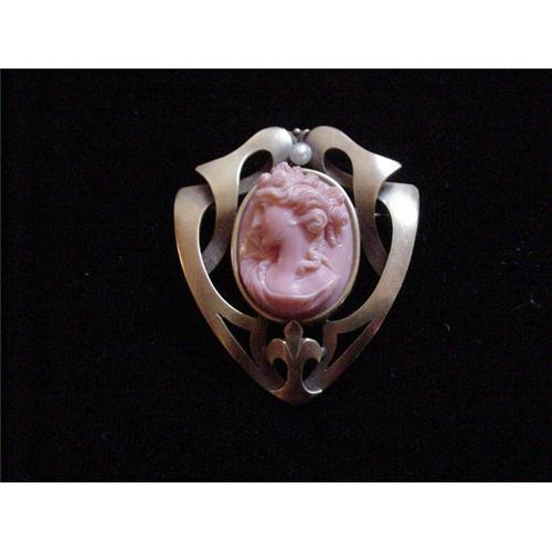 Gorgeous 14 Kt yellow gold coral cameo and Pearl Art Noureau brooch in fabulous condition. Delicate carving. Dramatic Art Noureau frame.
