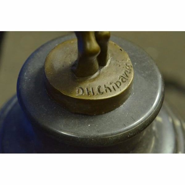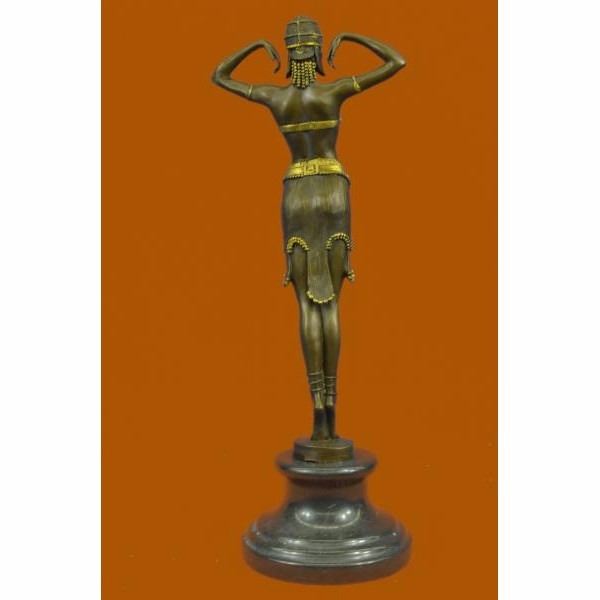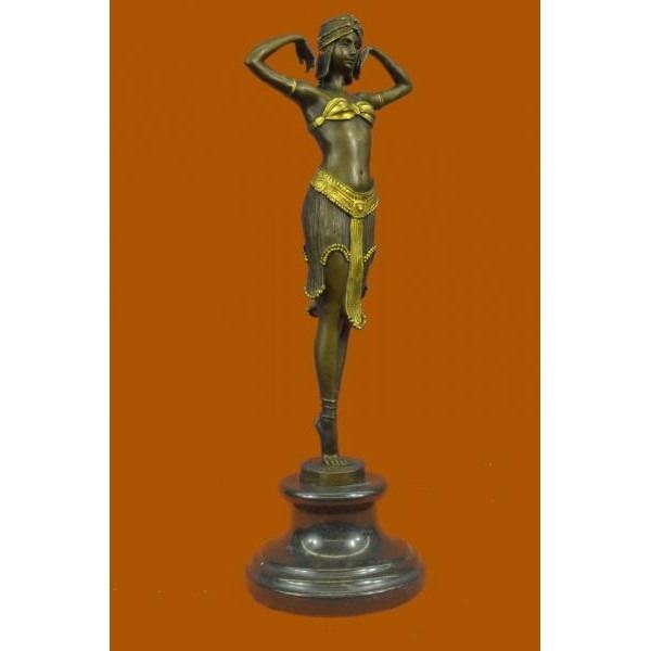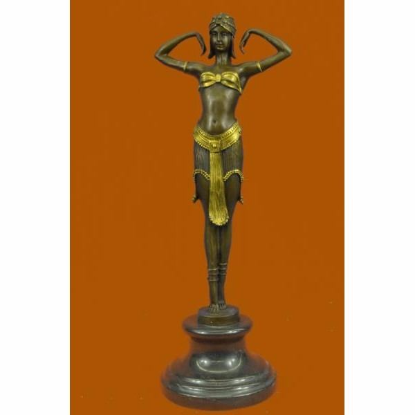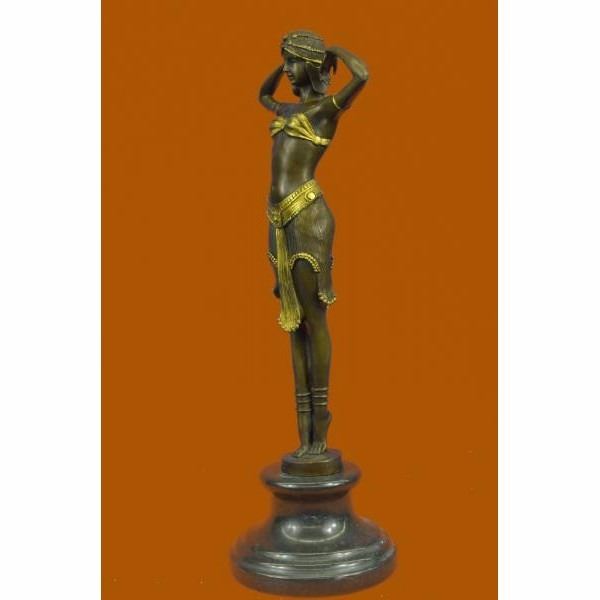 This Art Nouveau classic by Dimitri Chiparus takes full advantage of the capabilities of the _lost wax" bronze casting technique to render amazing detail. ABOUT YOUR BRONZE SCULPTURE: We understand the hesitation to purchase an expensive bronze over the Internet. Indeed, there is a benefit to physically holding any work of art in your own hands to give it a thorough evaluation. However, we assure you that these are some of the finest museum quality bronzes being made. HOW IS IT MADE? The piece is cast in the finest grade of silicon bronze. It costs more than other grades of bronze, but it simply looks better and lasts longer. From creating the mold to finish polishing, and every step in the process in between, everything takes place at the foundry in the Europe. We stand behind every bronze with a 100% customer satisfaction guarantee. If you are not completely satisfied with your purchase, return it to us in its original packing materials and we will refund your money excluding the shipping charge. Why can we make this guarantee? Simply because it is rare that a customer returns a bronze! In fact, most of our customers come back to purchase bronzes from us again and again. Condition: This sculpture is in perfect condition. Bronze Dimensions with Marble Base:Height 16" x Width 6" Marble Dimensions: Diameter 5 ". Height without base: 13" Weight : 8 LBS Inventory 25YRD1244BG4552
