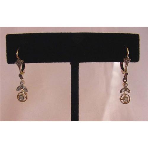 </font></strong>Lovely and delicate platinum on 18K yellow gold diamond earrings from the early 1900's. The top section of each earring has a fan motif with a Rose Cut diamond in the center, a Rose Cut diamond base, and a lever or french clip back. The bottom section has three Rose Cut diamonds in a leaf motif above a collet set Old Mine Cut diamond in a circular setting. The two Old Mine Cut diamonds total .08 Ct. The ten Rose Cut diamonds total .05 Ct. Earrings measure 7/8" long and 3/16" at the widest. Circa 1910. Excellent condition.</font>