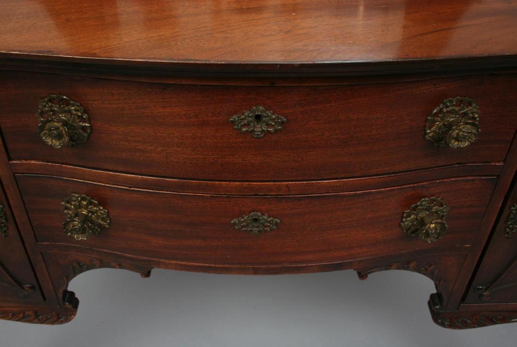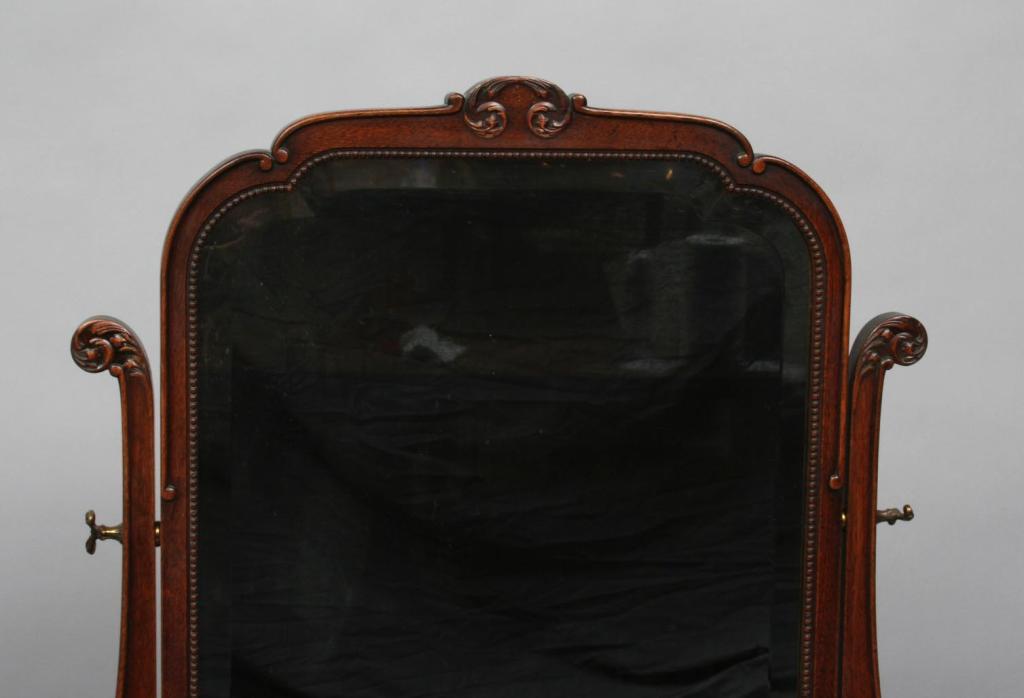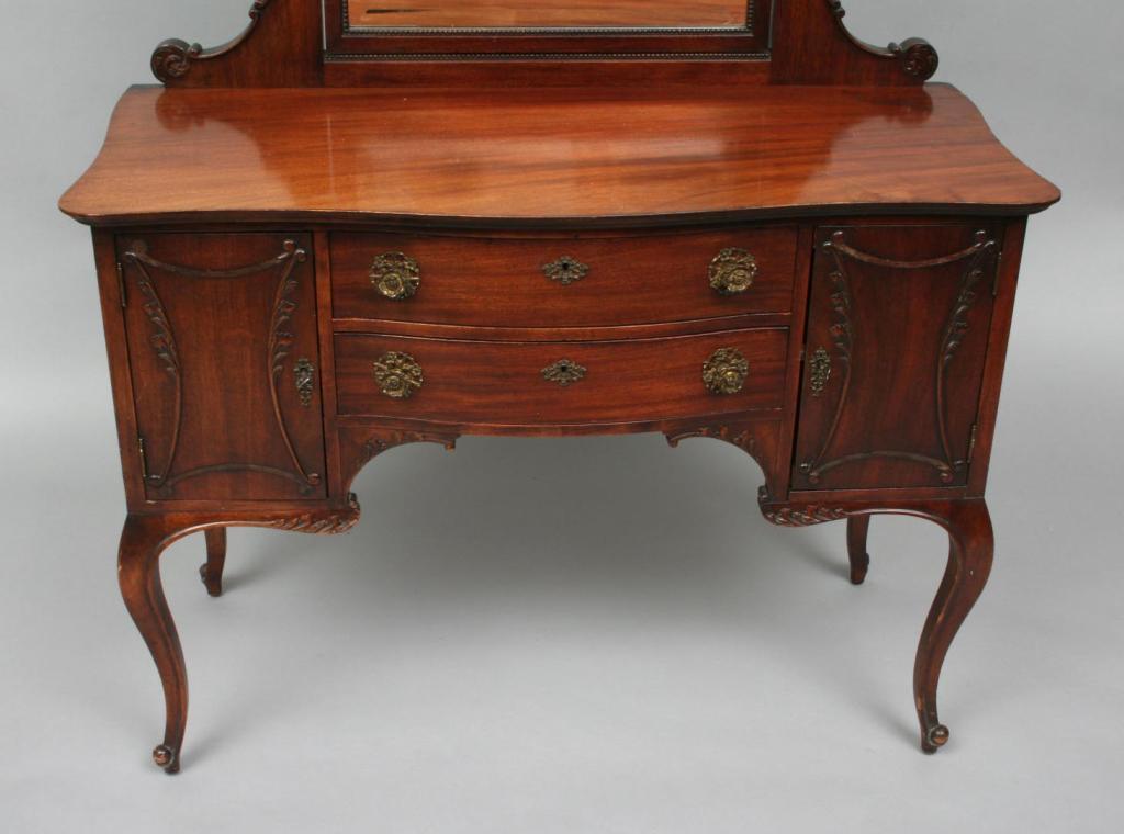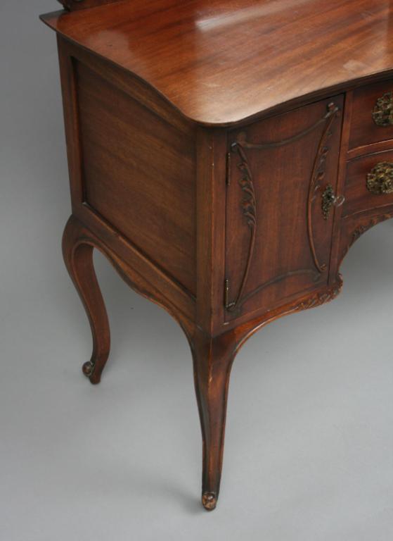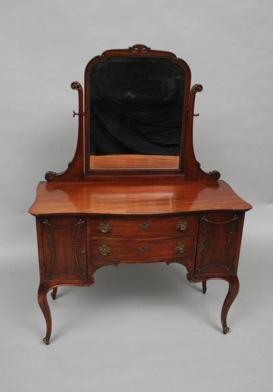 With a beveled and hinged looking glass flanked by scrolled supports, the rectangular top over two long drawers and two doors, raised on scrolled legs. 59"H. 41 1/2"W. 18"D. Condition: very good, some light surface imperfections, including light scratches and scuffs.