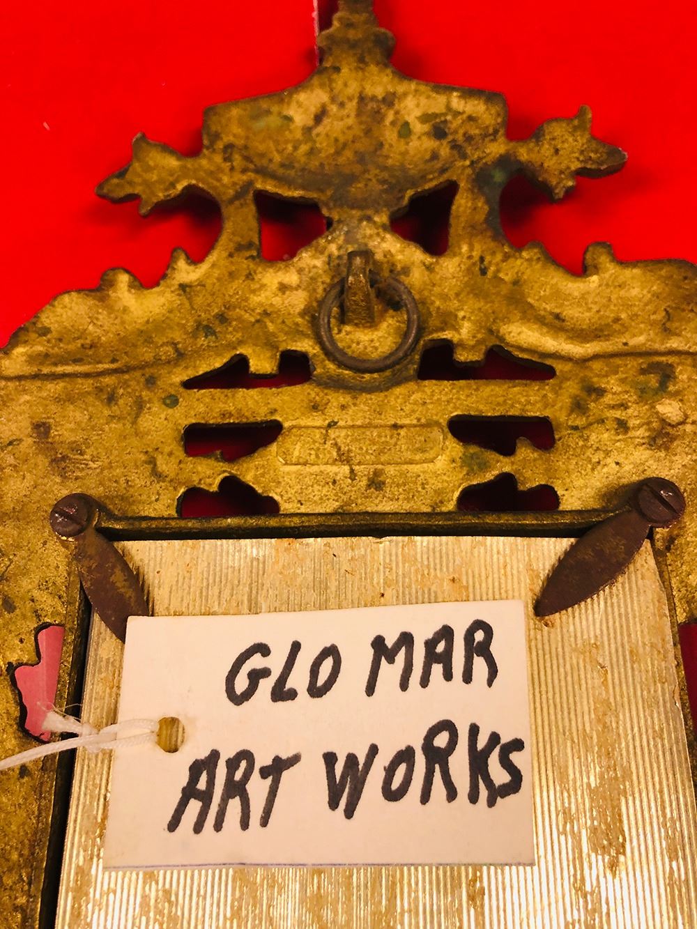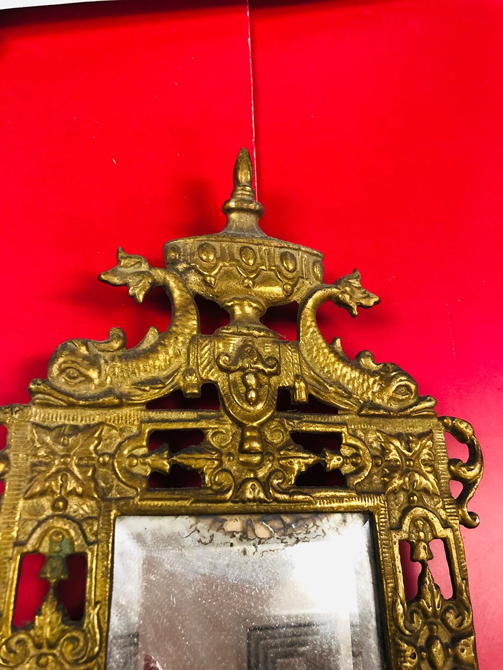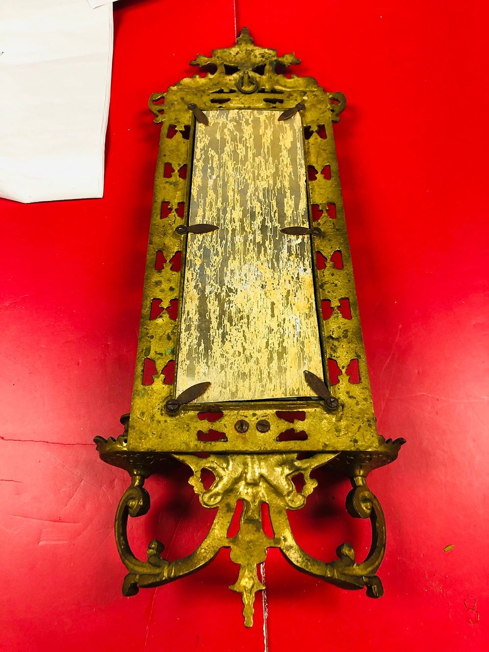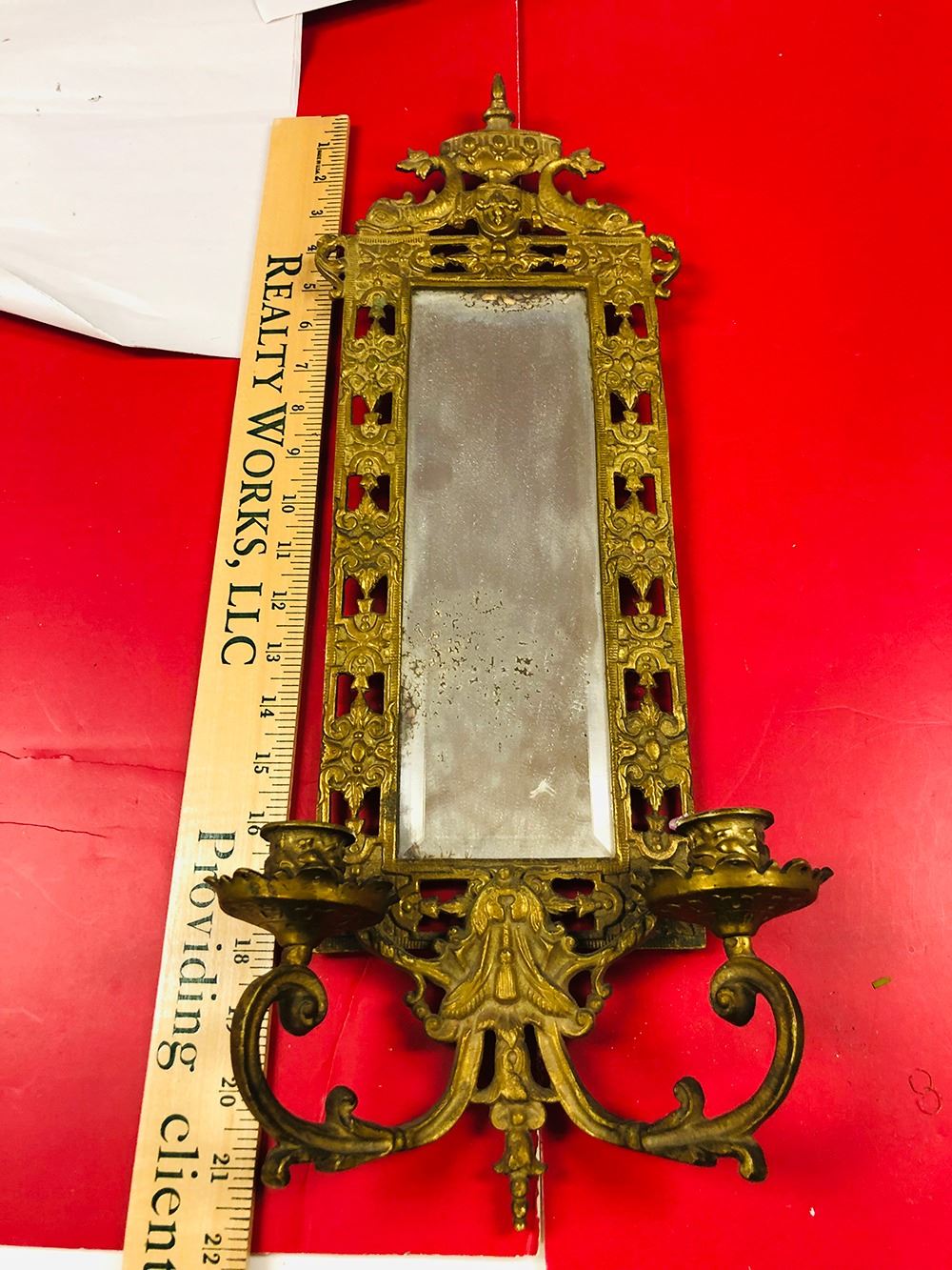Art Nouveau Glo-Mar Artworks, NY brass candelabra, ornate double candle with bevelled mirror.