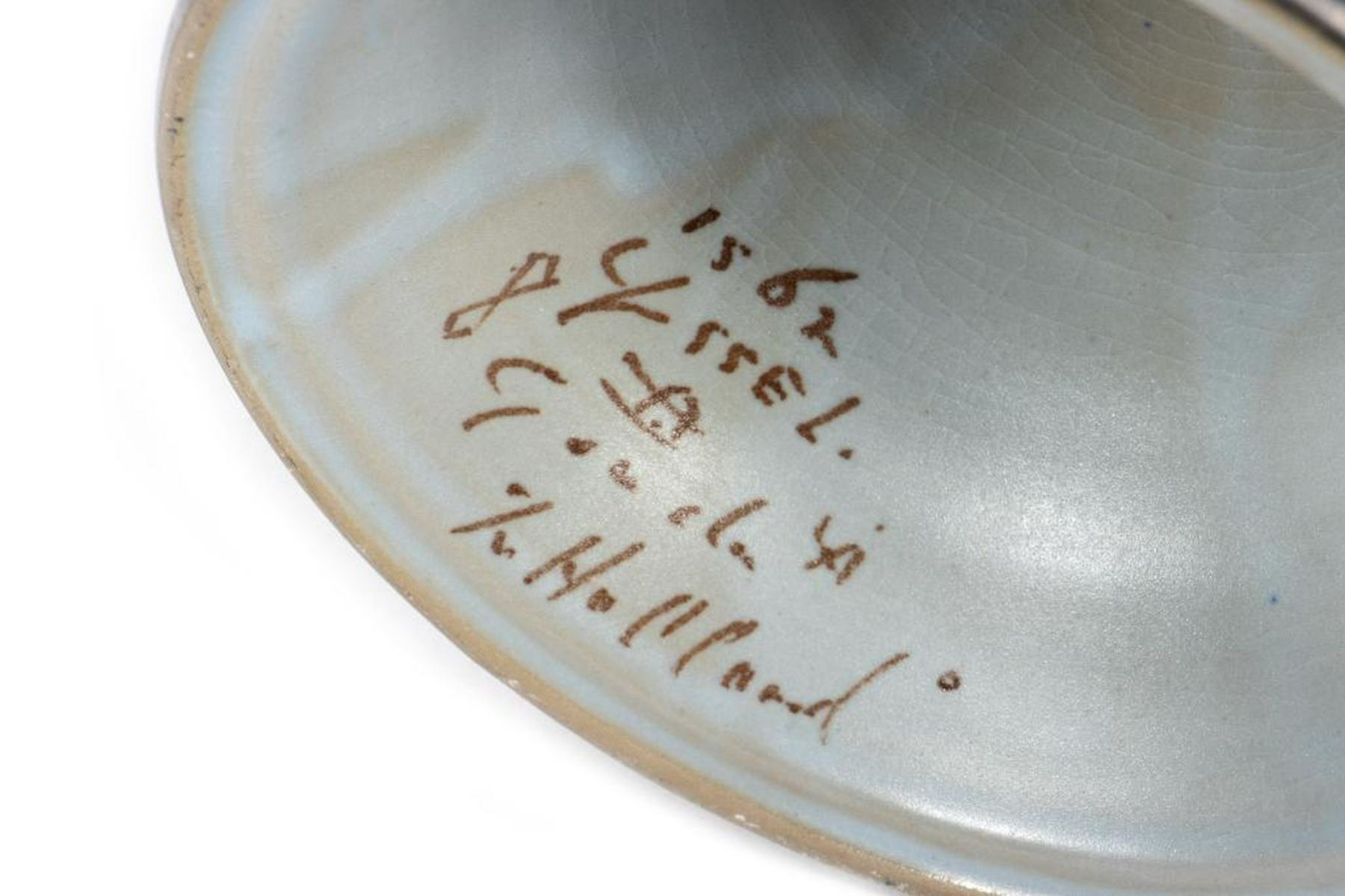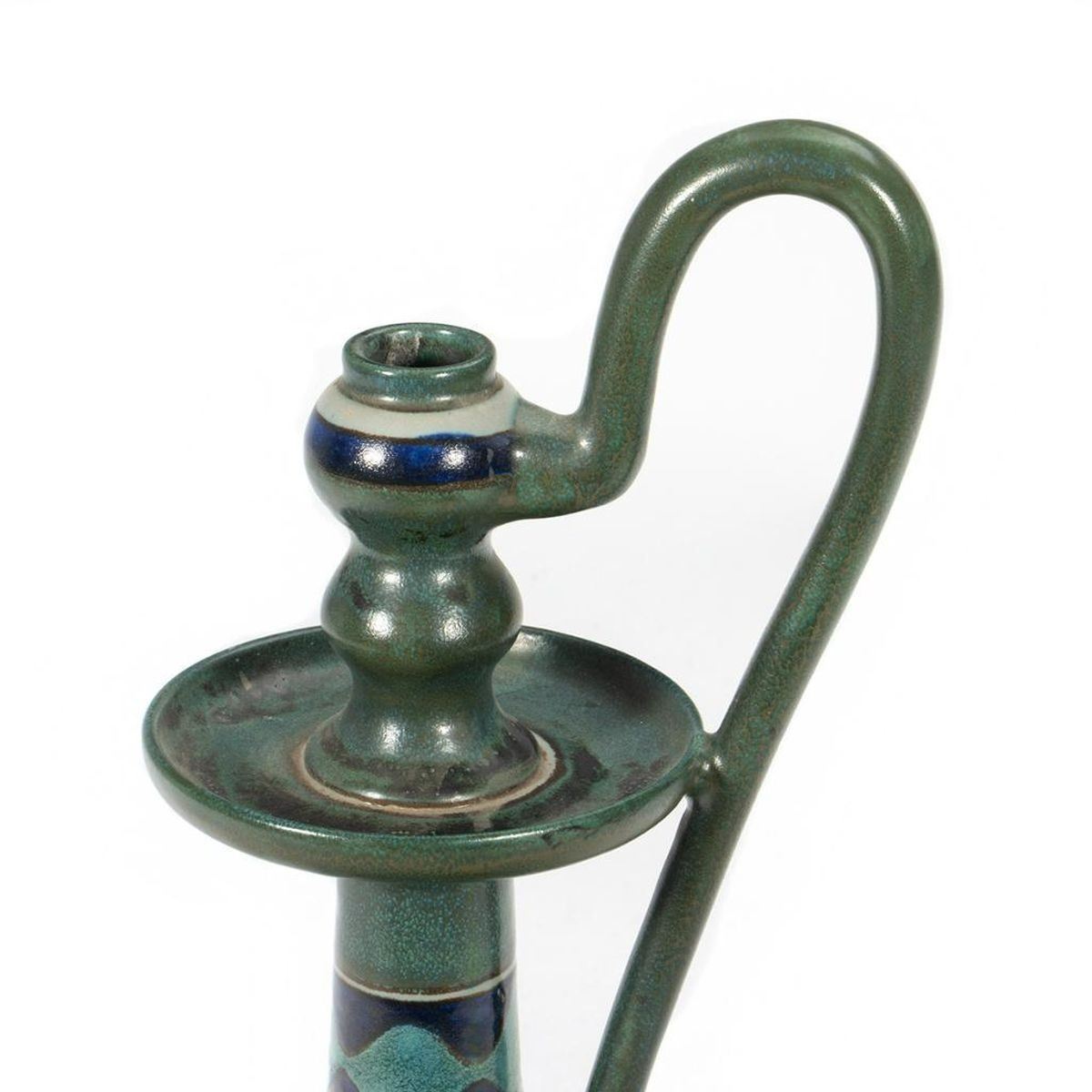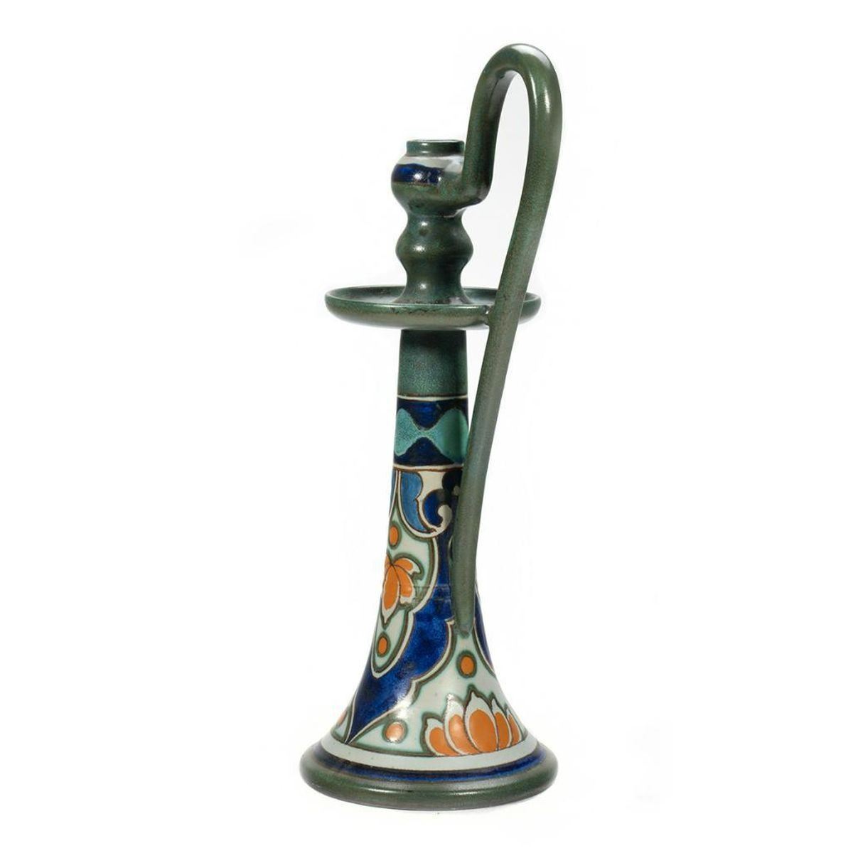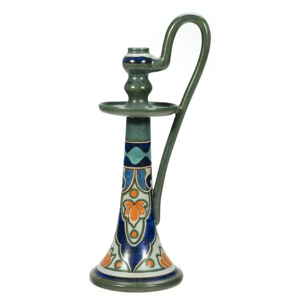 The tall tapering form with loop handle. Mark on base: '1562, Yssel, Gouda, Holland.' 17in. h. Condition: Very good, no chips or cracks.