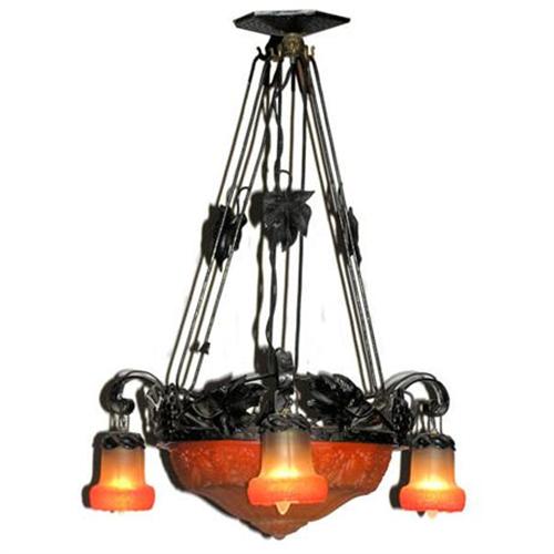 This old French Art Nouveau metal chandelier has its original center globe and three smaller globes of molded glass. They have a warm reddish orange color (reminiscient of American amberina glass) and intricate floral detail. Fine working order. Metalwork features a grapevine motif which is complemented by the center globe which features a harvest motif of flowers and blooming plants. Measures 23.75 from the center of each of the three candle bulbs and measures roughly 35" high. This item resides on the upper west side of Manhattan ( New York city ) and may be seen by appointment.