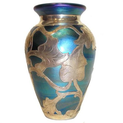 This beautiful iridescent glass vase with silver overlay dates from the Art Nouveau period and is in excellent condition. Silver has the impressed purity mark " 999 " near the base but we did not find a maker's mark. Maker is unknown. Likely of American origin and very likely from Alvin Manufacturing Company of Providence Rhode Island. (Launched in 1886, Alvin was known for their Art Nouveau designs and is known to have created 999 pure silver overlay pieces in this style. This firm likely purchased iridescent vases from Steuben or Quezal. Alvin was eventually acquired Gorham.) Measures 6.5" high and 4" across. No visible chips or cracks. This item comes from an impressive collection of antique Bohemian, American and French glass numbering over 150 items. It resides with our client on the Upper East Side of Manhattan in New York city, and may be seen by appointment.