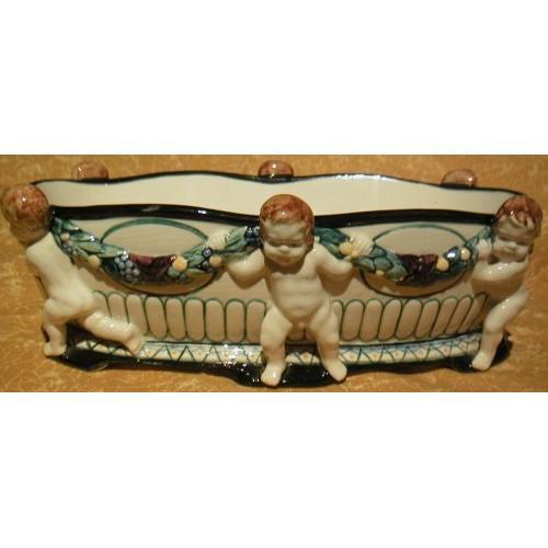 Perfect and very decorative Jardiniere with six puttis holding a flower garland around the bowl.It comes out from the very well known German factory Karlsruher Majolica and is created from the famous artist Wilhelm Peter August Süs(1861-1933).Süs was one of the first artists who worked for this factory. Later he was the art direktor of the Karlsruher Majolica.Bowls with puttis or children from this artist are in great demand.