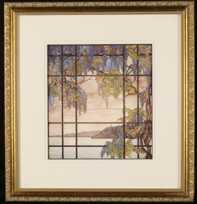 This is a photograph of a beautiful Art Nouveau style stained glass window of a Mediterranean coast with luscious grapes.Medium: PhotographImage size: 9 x 10 inches Framing: Matted in white, in decorative gold painted wood frameFrame size: 16 1/2 x 17 1/2 inches Condition: Excellent; picture wire on back needs to be readjusted If you can't have the actual stained glass, you can still enjoy it in this nicely framed photo.