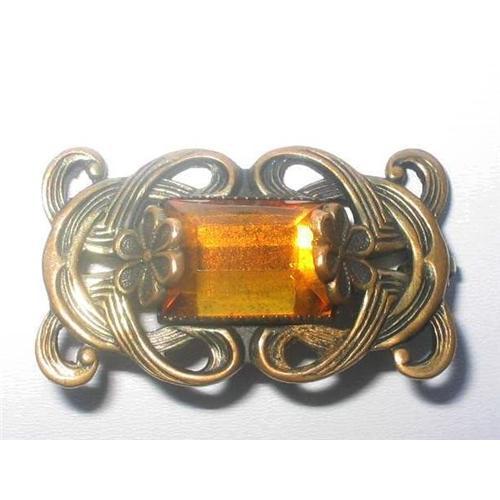 A lovely example of Art Nouveau, Arts & Crafts jewellery in this very ornate brass brooch with a large centre stone of topas color Czech glass, beautifully faceted and elaborately set with a flower at each end. Gorgeous deep topaz colour. Measures 1-1/2" inches from east to west, by 3/4" inches in height. Has the old "C" close.
