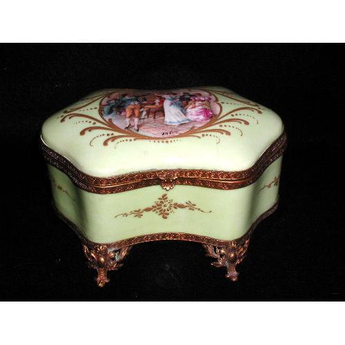 Beautiful 19th century French porcelain dresser box is hand painted by "Andre" and depicts three couples clad in the dress of the day,long dresses,waist coats and stockings,at a social event,talking and dancing. Coloring is outstanding against the pale green porcelain background. Gilt ornate painting outlines the picture as well as all four sides of the box with floral and leaf design. Foliate brass work edges the lid with latch and the top and bottom edges of the box. Stands on ornate ormolu feet. Painted bouquet on the interior of lid and box with white background. Signed on the bottom with the manufacturers mark and symbol "FBS" with Madine France" below. In excellent condition. Measures 6.5L X 4.5W X 4.25.