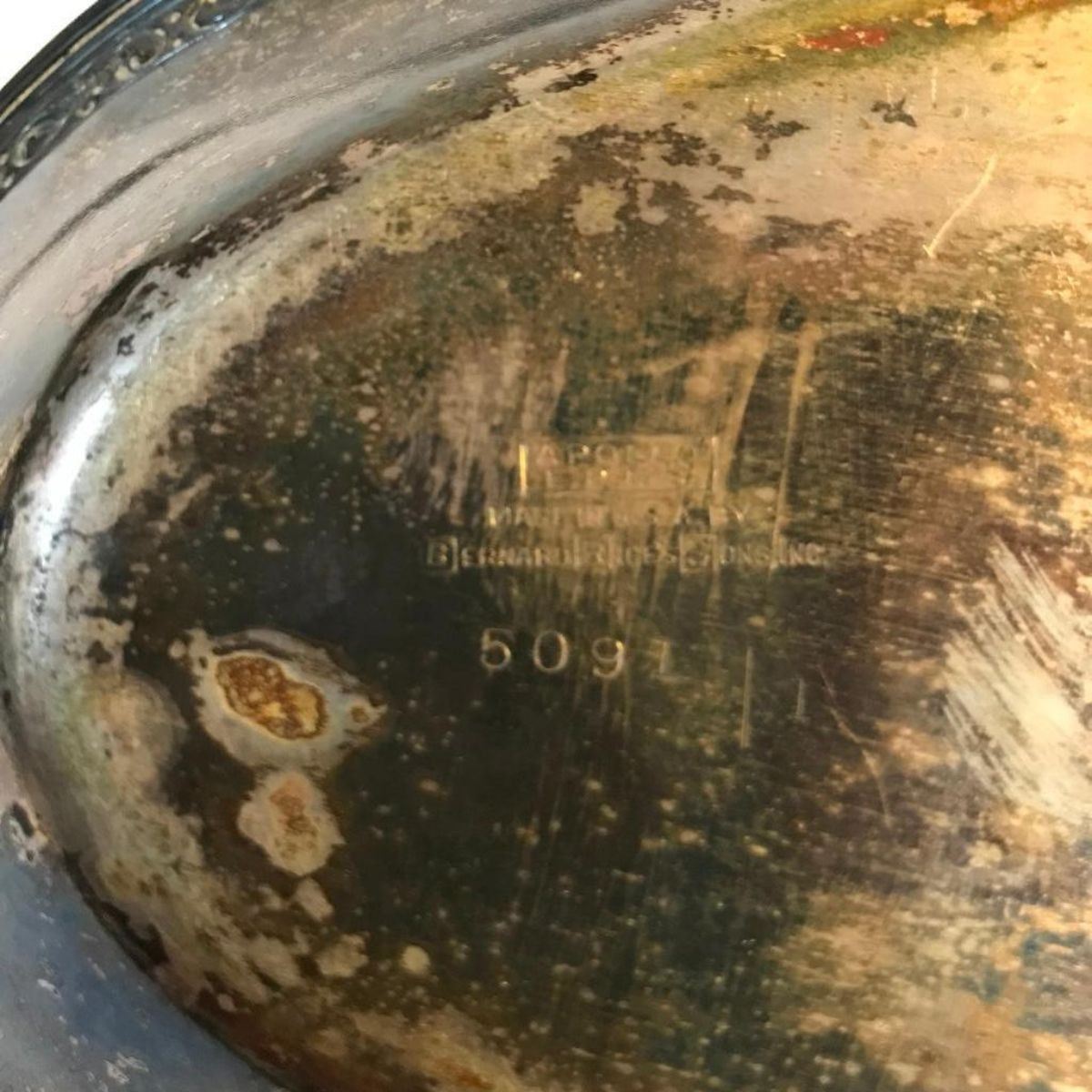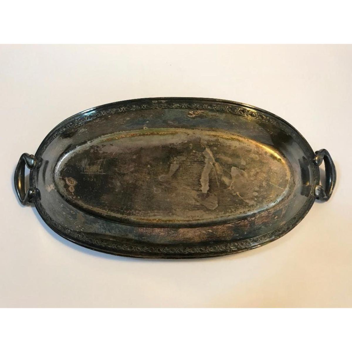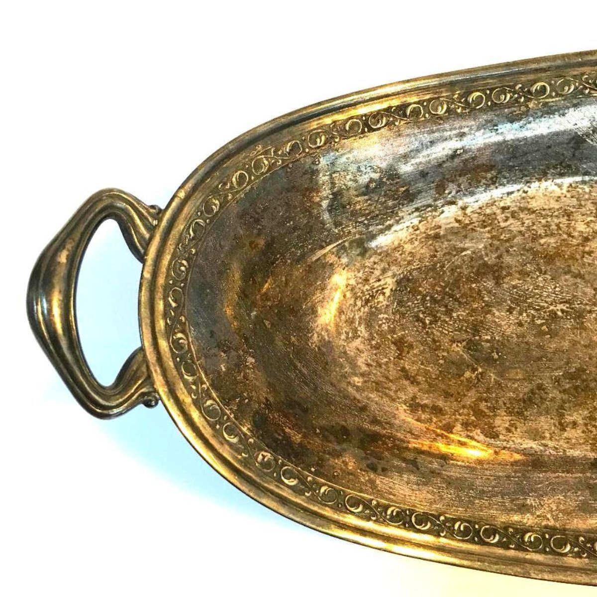 Art Nouveau silver-plate handled bread tray. Stamped "Apollo E.P.N.S., Made in USA by Bernard Rice's Sons, Inc. 5091". 14 1/4" L handle to handle, 6 1/4" W.