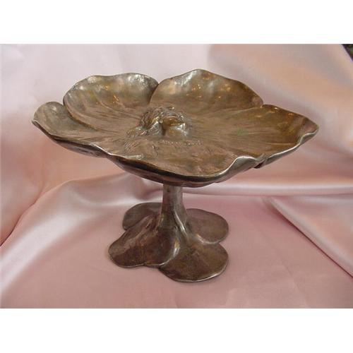This is a wonderful French Art Nouveau signed silver washed bronze centerpiece or bowl featuring a large lily pad with a young girl in the center. The piece measures 5 1/2" tall by 9 1/2" wide. The footed base is composed of four overlapping lily pads. The signature on top, difficult to see in a picture, looks to be Polet. This very unique piece has an excellent patina and extremly good detail. Circa 1900 and in excellent condition.