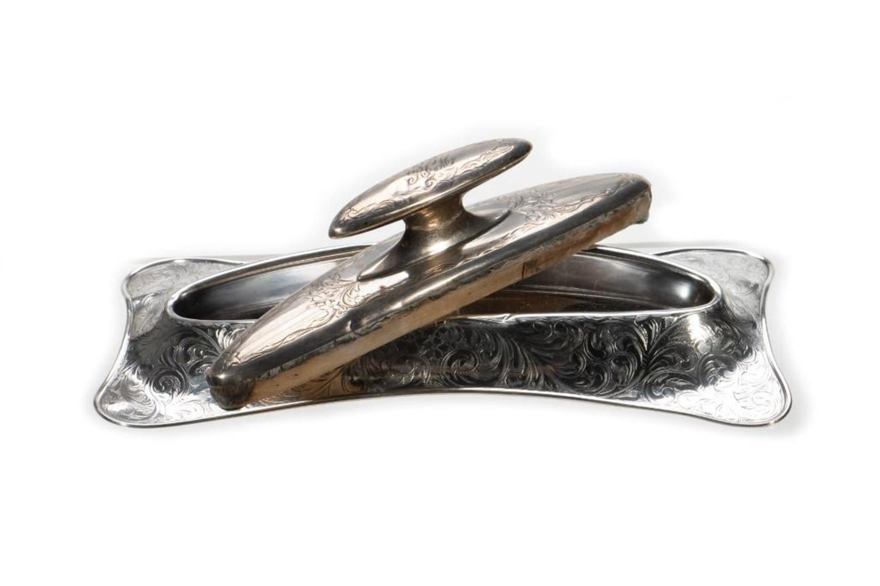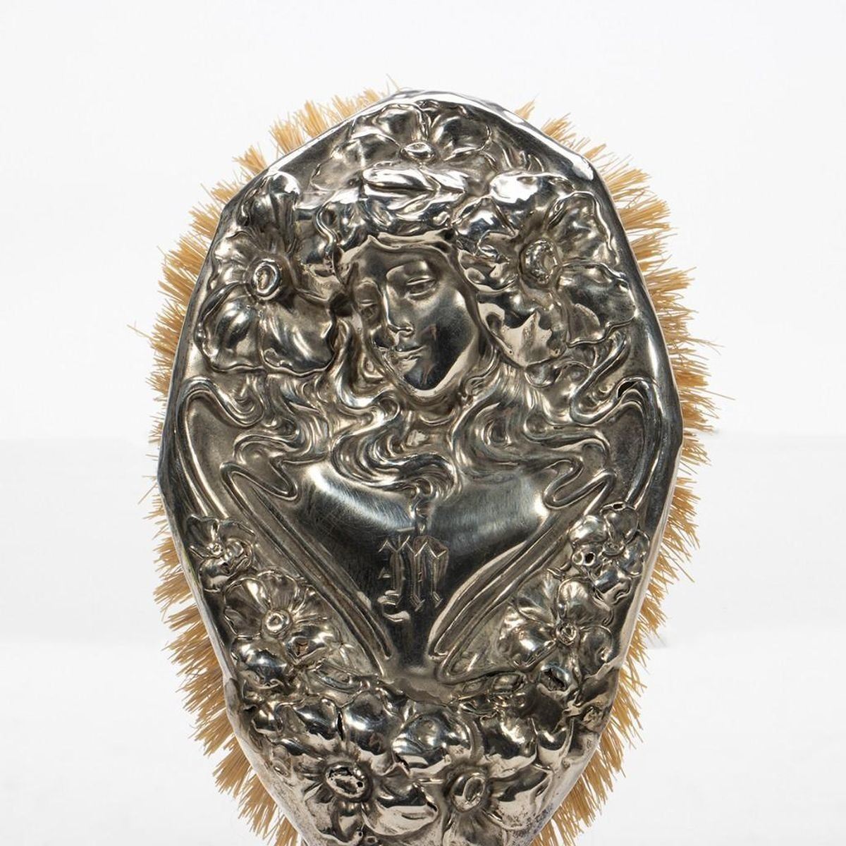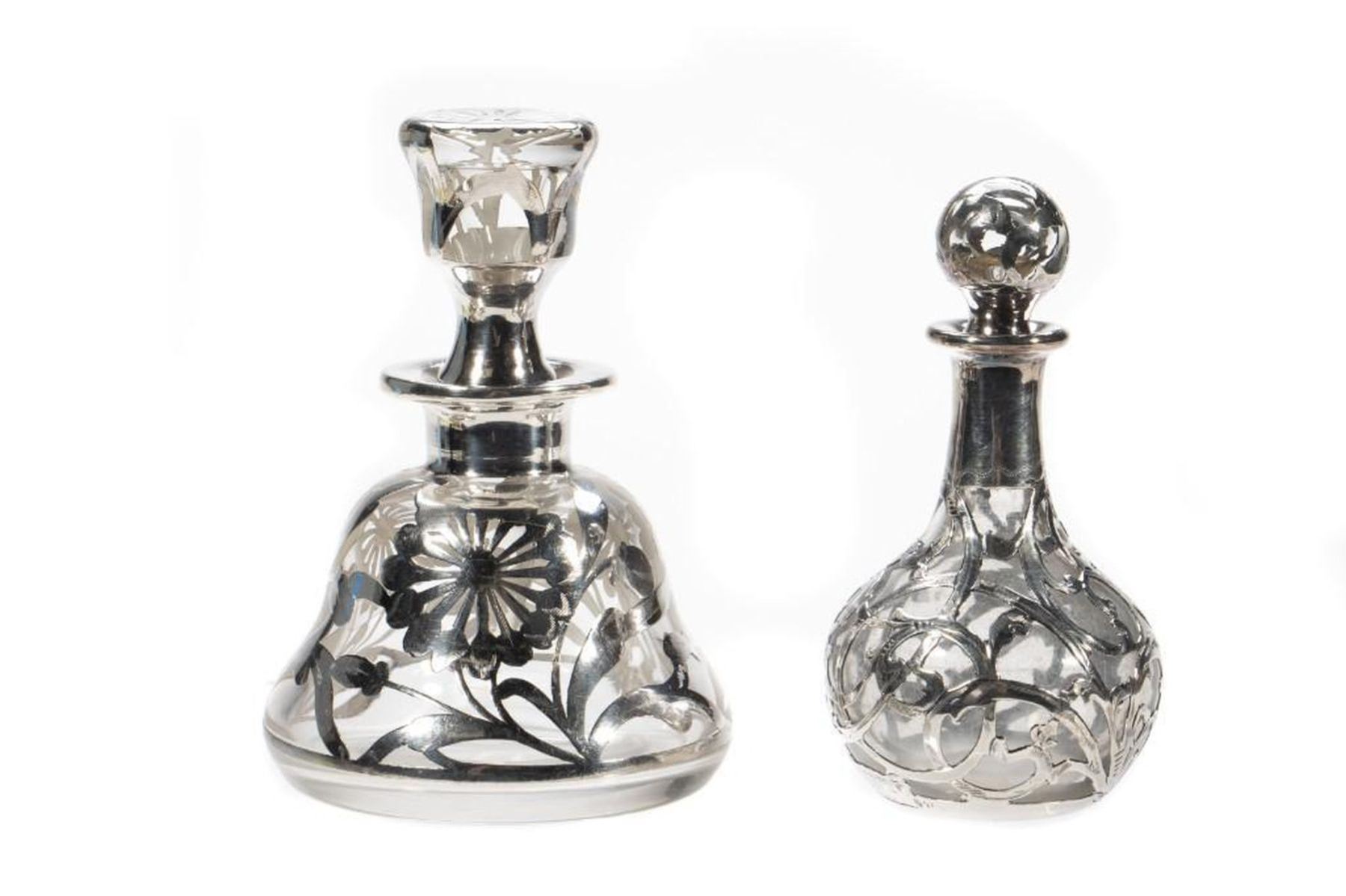 An assembled collection, including brushes, silver overlay scent bottles and mirror. (12 pieces) greatest length 9in.