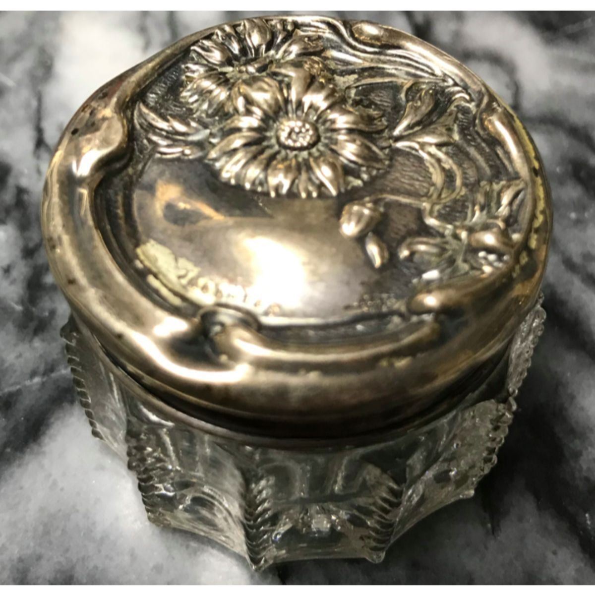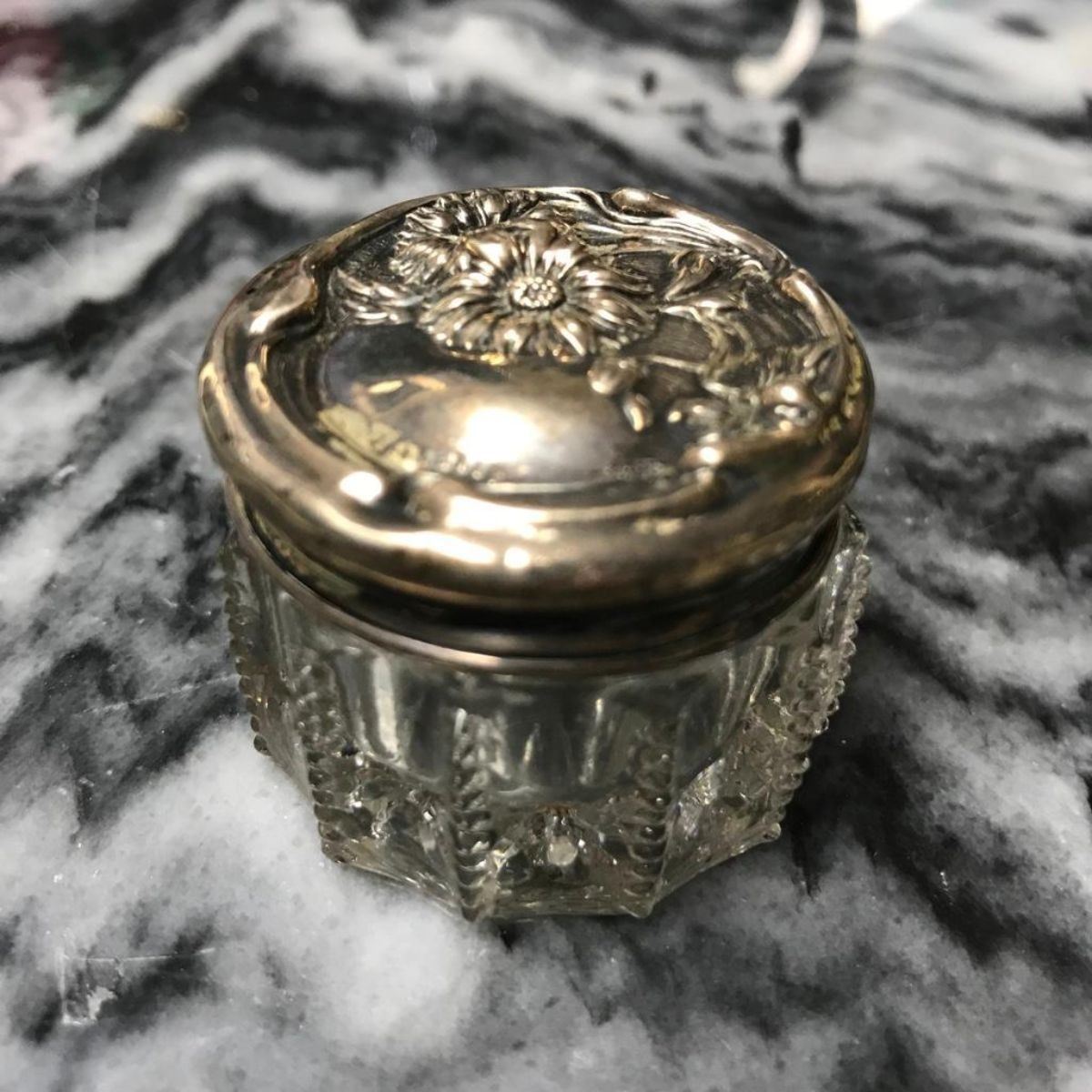 Small 1 5/8" D antique Art Nouveau dresser, vanity jar, cut glass body with stamped sterling silver floral embossed lid.Â